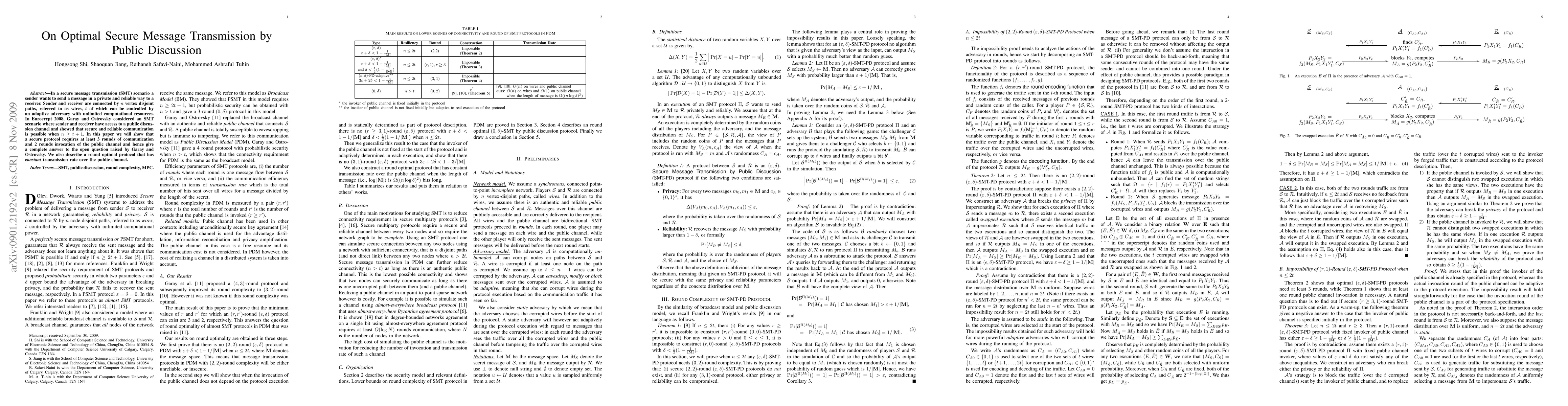 This paper investigates optimal secure message transmission (SMT) through public discussion channels, proving that secure communication requires at least 3 rounds and 2 rounds of public channel use, addressing an open question from a previous study. It also presents a round-optimal protocol with a constant transmission rate.