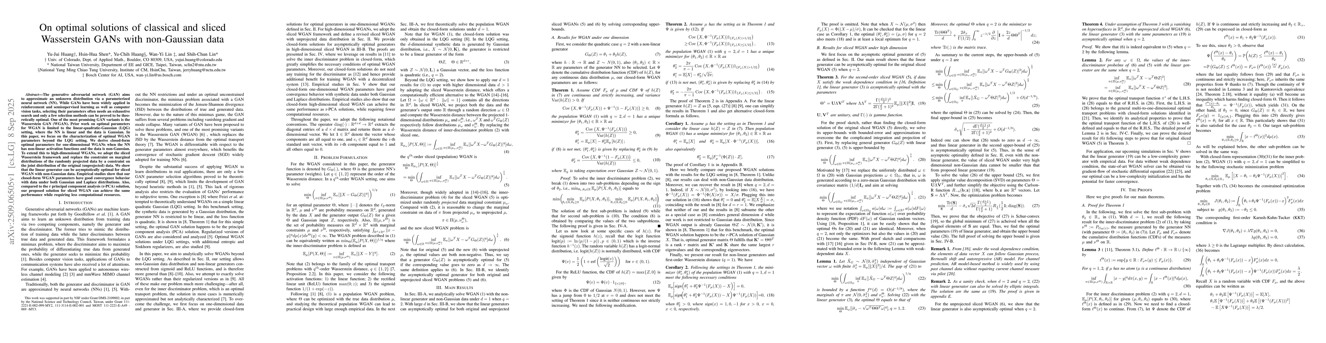 The generative adversarial network (GAN) aims to approximate an unknown distribution via a parameterized neural network (NN). While GANs have been widely applied in reinforcement and semisupervised learning as well as computer vision tasks, selecting their parameters often needs an exhaustive search and only a few selection methods can be proved to be theoretically optimal. One of the most promising GAN variants is the Wasserstein GAN (WGAN). Prior work on optimal parameters for WGAN is limited to the linear-quadratic-Gaussian (LQG) setting, where the NN is linear and the data is Gaussian. In this paper, we focus on the characterization of optimal WGAN parameters beyond the LQG setting. We derive closed-form optimal parameters for one-dimensional WGANs when the NN has non-linear activation functions and the data is non-Gaussian. To extend this to high-dimensional WGANs, we adopt the sliced Wasserstein framework and replace the constraint on marginal distributions of the randomly projected data by a constraint on the joint distribution of the original (unprojected) data. We show that the linear generator can be asymptotically optimal for sliced WGAN with non-Gaussian data. Empirical studies show that our closed-form WGAN parameters have good convergence behavior with data under both Gaussian and Laplace distributions. Also, compared to the r principal component analysis (r-PCA) solution, our proposed solution for sliced WGAN can achieve the same performance while requiring less computational resources.