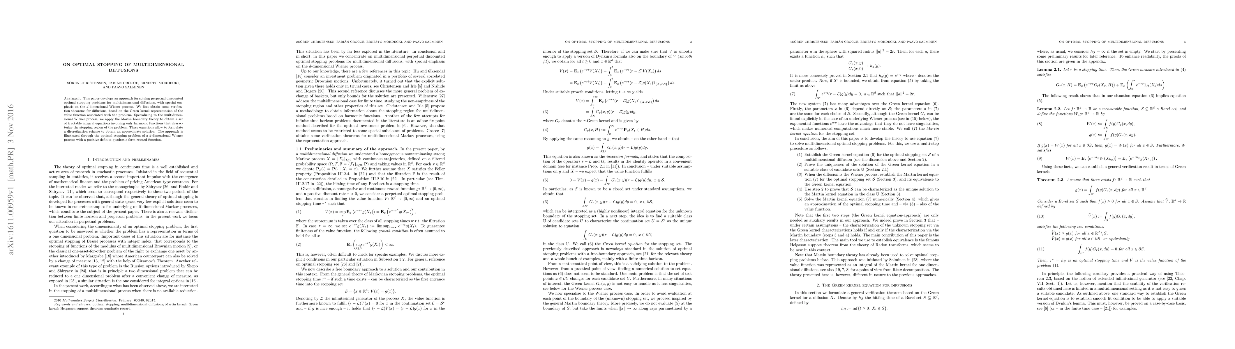 This paper presents a method for solving perpetual discounted optimal stopping problems for multidimensional diffusions, focusing on the $d$-dimensional Wiener process. It utilizes verification theorems and Martin boundary theory to derive integral equations characterizing the stopping region, enabling a discretization scheme for approximate solutions.