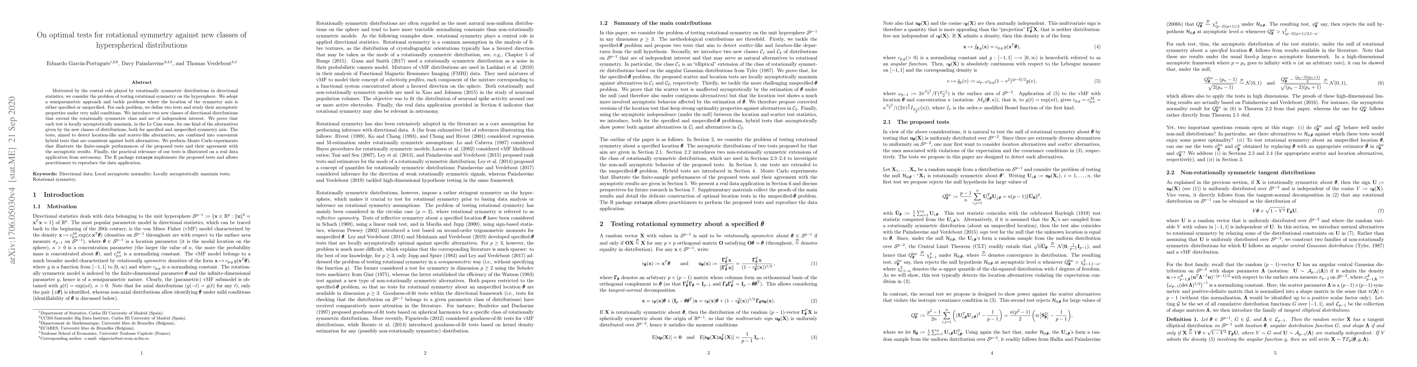 This paper develops optimal semiparametric tests for rotational symmetry on the hypersphere, introducing new classes of hyperspherical distributions. It combines location-like and scatter-like alternatives into hybrid tests, proving their local asymptotic minimaxity and demonstrating their performance through Monte Carlo simulations and a real data example in astronomy.