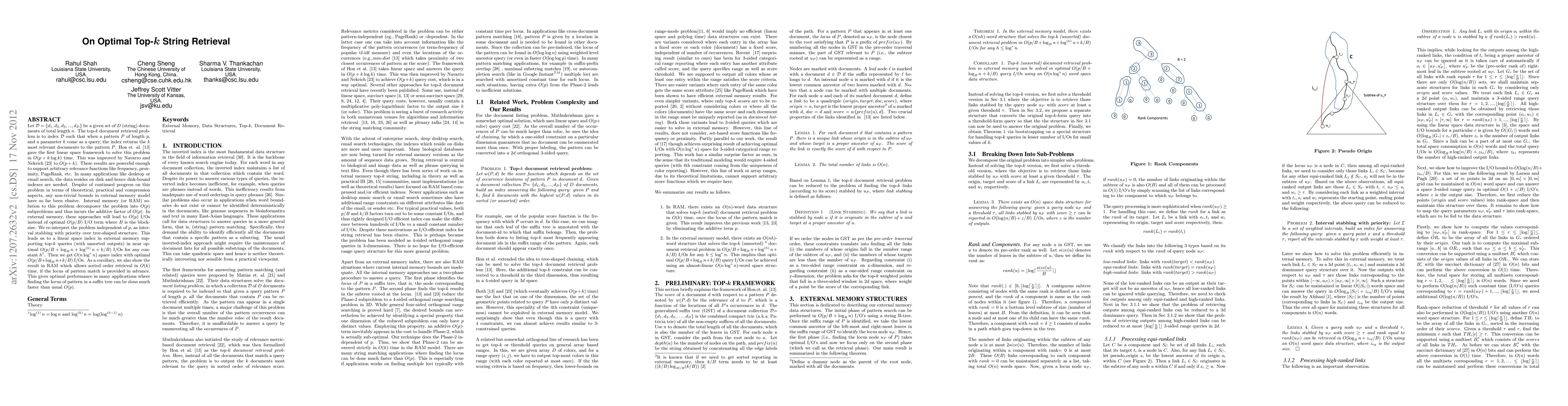 This work addresses the lack of non-trivial bounds in the external memory model for top-k string retrieval, improving upon previous results to support arbitrary relevance functions like frequency, proximity, and PageRank.