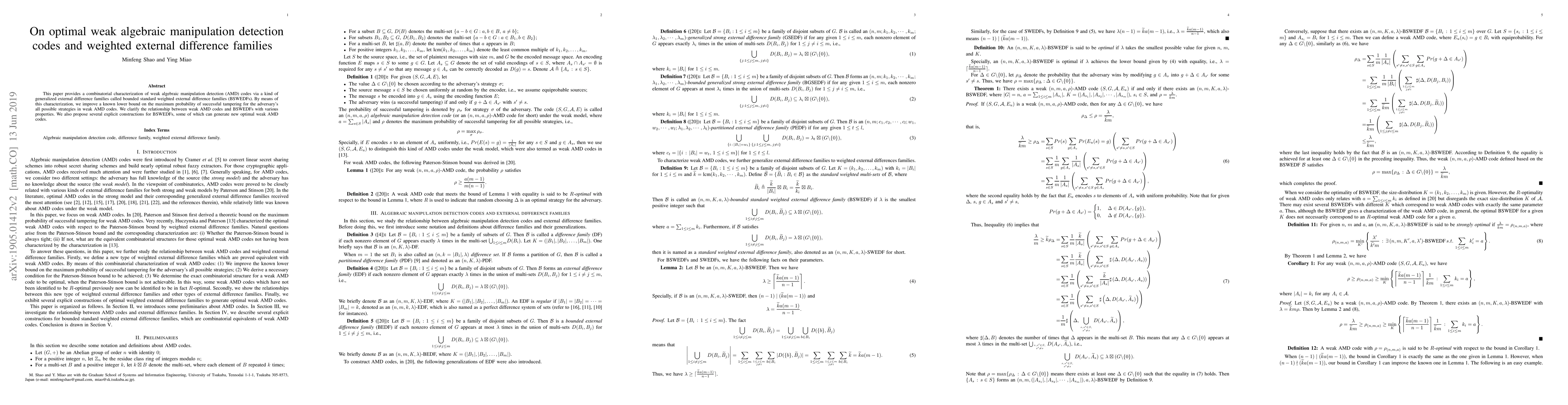 This paper characterizes weak algebraic manipulation detection codes using bounded standard weighted external difference families (BSWEDFs), improving the lower bound on the probability of successful tampering by adversaries. It also explores the relationship between weak AMD codes and BSWEDFs, proposing constructions that generate optimal weak AMD codes.