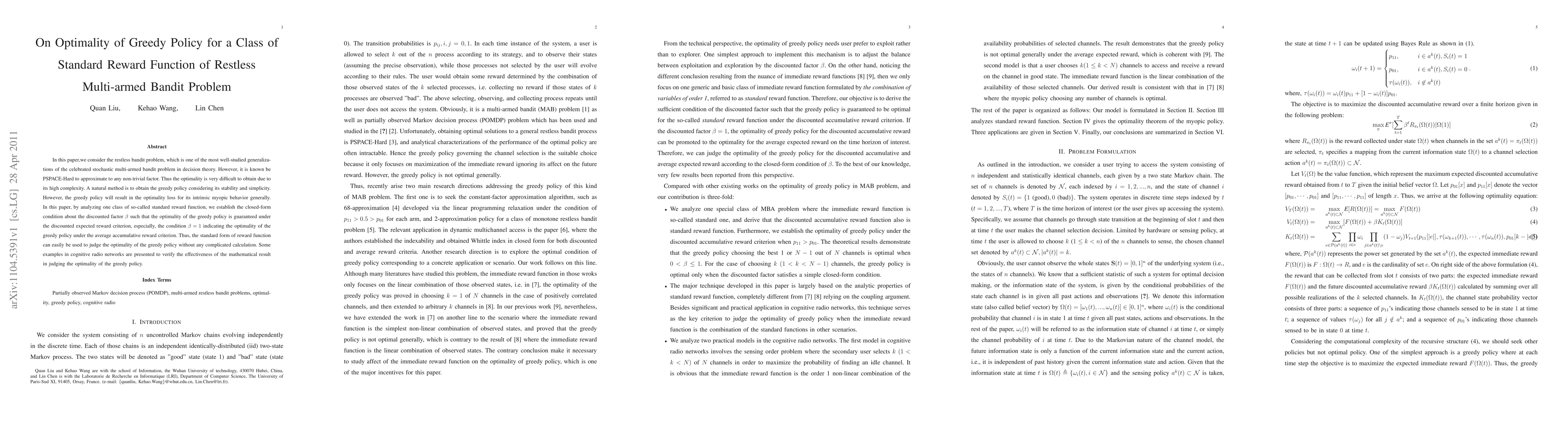 In this paper,we consider the restless bandit problem, which is one of the most well-studied generalizations of the celebrated stochastic multi-armed bandit problem in decision theory. However, it is known be PSPACE-Hard to approximate to any non-trivial factor. Thus the optimality is very difficult to obtain due to its high complexity. A natural method is to obtain the greedy policy considering its stability and simplicity. However, the greedy policy will result in the optimality loss for its intrinsic myopic behavior generally. In this paper, by analyzing one class of so-called standard reward function, we establish the closed-form condition about the discounted factor \beta such that the optimality of the greedy policy is guaranteed under the discounted expected reward criterion, especially, the condition \beta = 1 indicating the optimality of the greedy policy under the average accumulative reward criterion. Thus, the standard form of reward function can easily be used to judge the optimality of the greedy policy without any complicated calculation. Some examples in cognitive radio networks are presented to verify the effectiveness of the mathematical result in judging the optimality of the greedy policy.