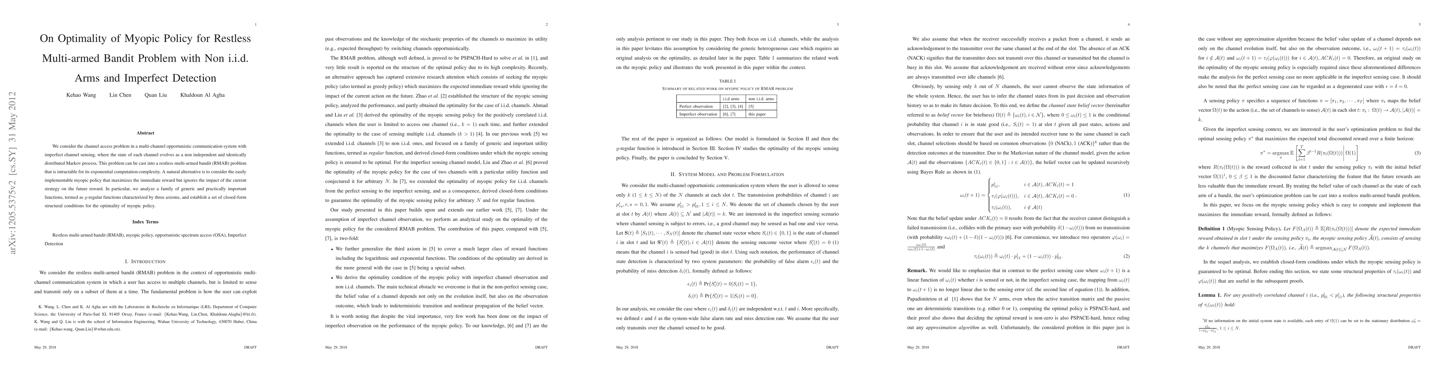 We consider the channel access problem in a multi-channel opportunistic communication system with imperfect channel sensing, where the state of each channel evolves as a non independent and identically distributed Markov process. This problem can be cast into a restless multi-armed bandit (RMAB) problem that is intractable for its exponential computation complexity. A natural alternative is to consider the easily implementable myopic policy that maximizes the immediate reward but ignores the impact of the current strategy on the future reward. In particular, we develop three axioms characterizing a family of generic and practically important functions termed as $g$-regular functions which includes a wide spectrum of utility functions in engineering. By pursuing a mathematical analysis based on the axioms, we establish a set of closed-form structural conditions for the optimality of myopic policy.