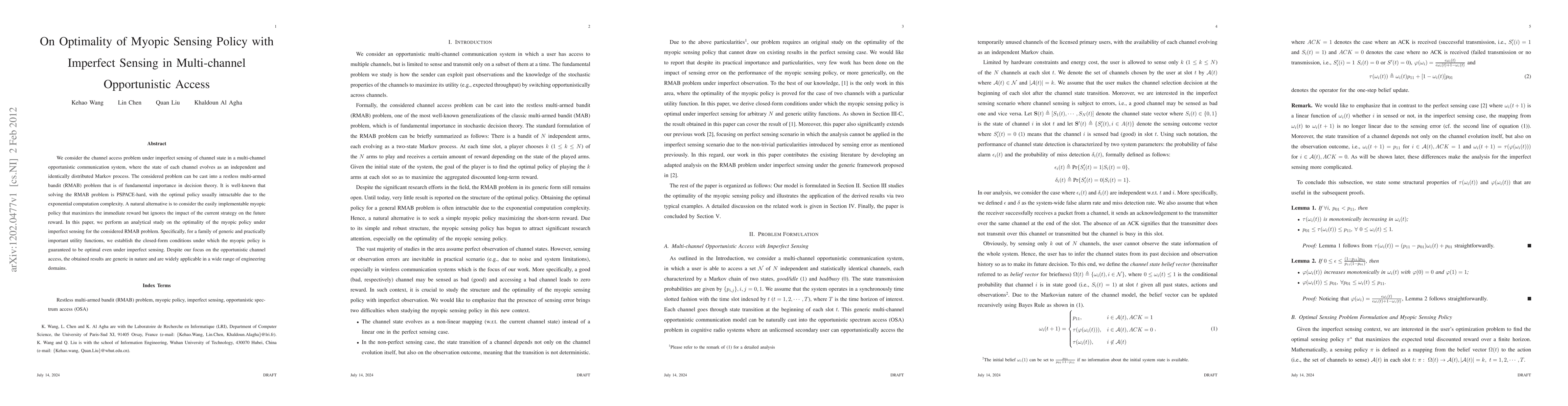 A novel myopic policy was developed that achieves optimality for restless multi-armed bandit problems with imperfect channel state detection.