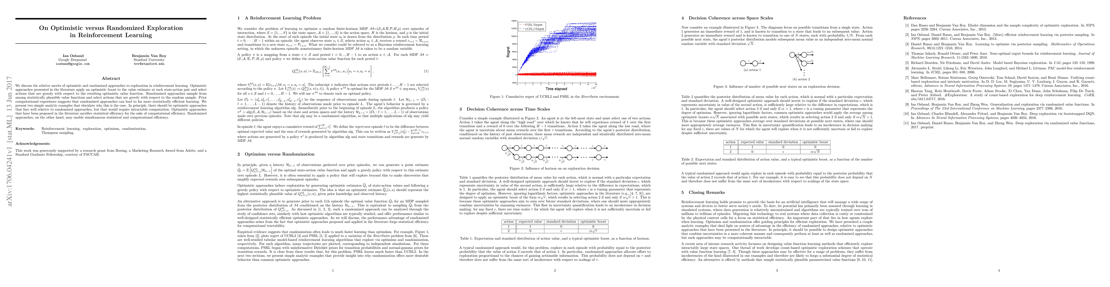 We discuss the relative merits of optimistic and randomized approaches to exploration in reinforcement learning. Optimistic approaches presented in the literature apply an optimistic boost to the value estimate at each state-action pair and select actions that are greedy with respect to the resulting optimistic value function. Randomized approaches sample from among statistically plausible value functions and select actions that are greedy with respect to the random sample. Prior computational experience suggests that randomized approaches can lead to far more statistically efficient learning. We present two simple analytic examples that elucidate why this is the case. In principle, there should be optimistic approaches that fare well relative to randomized approaches, but that would require intractable computation. Optimistic approaches that have been proposed in the literature sacrifice statistical efficiency for the sake of computational efficiency. Randomized approaches, on the other hand, may enable simultaneous statistical and computational efficiency.