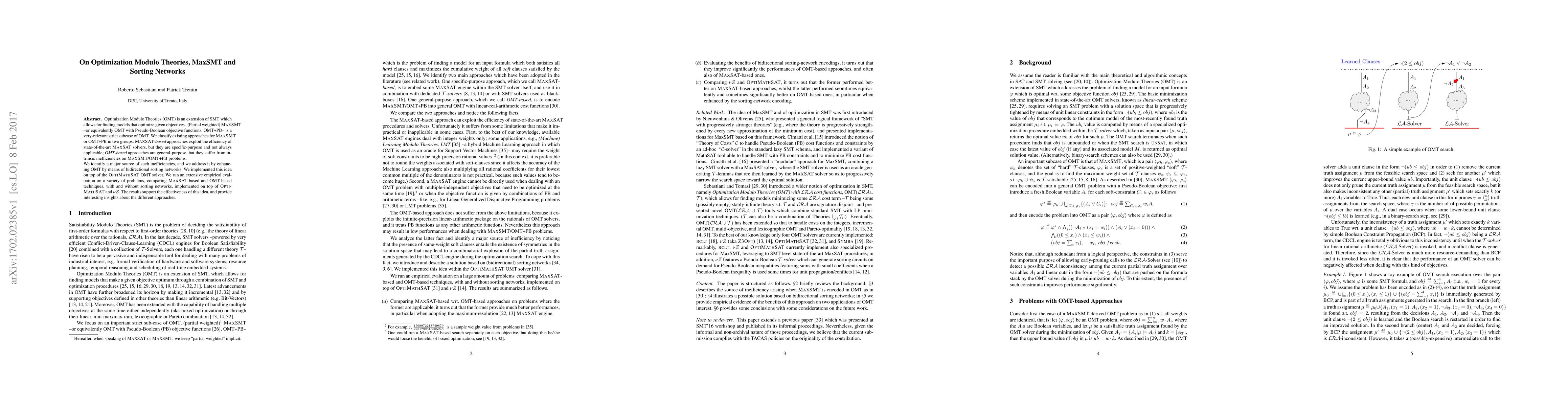 Optimization Modulo Theories (OMT) is an extension of SMT which allows for finding models that optimize given objectives. (Partial weighted) MaxSMT --or equivalently OMT with Pseudo-Boolean objective functions, OMT+PB-- is a very-relevant strict subcase of OMT. We classify existing approaches for MaxSMT or OMT+PB in two groups: MaxSAT-based approaches exploit the efficiency of state-of-the-art MAXSAT solvers, but they are specific-purpose and not always applicable; OMT-based approaches are general-purpose, but they suffer from intrinsic inefficiencies on MaxSMT/OMT+PB problems. We identify a major source of such inefficiencies, and we address it by enhancing OMT by means of bidirectional sorting networks. We implemented this idea on top of the OptiMathSAT OMT solver. We run an extensive empirical evaluation on a variety of problems, comparing MaxSAT-based and OMT-based techniques, with and without sorting networks, implemented on top of OptiMathSAT and {\nu}Z. The results support the effectiveness of this idea, and provide interesting insights about the different approaches.