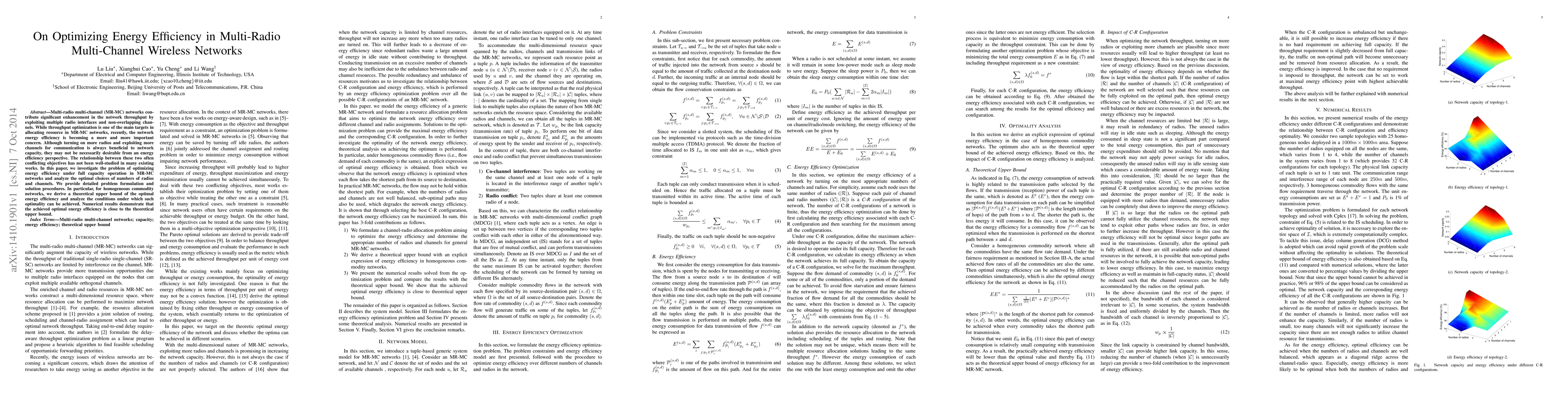 Multi-radio multi-channel (MR-MC) networks contribute significant enhancement in the network throughput by exploiting multiple radio interfaces and non-overlapping channels. While throughput optimization is one of the main targets in allocating resource in MR-MC networks, recently, the network energy efficiency is becoming a more and more important concern. Although turning on more radios and exploiting more channels for communication is always beneficial to network capacity, they may not be necessarily desirable from an energy efficiency perspective. The relationship between these two often conflicting objectives has not been well-studied in many existing works. In this paper, we investigate the problem of optimizing energy efficiency under full capacity operation in MR-MC networks and analyze the optimal choices of numbers of radios and channels. We provide detailed problem formulation and solution procedures. In particular, for homogeneous commodity networks, we derive a theoretical upper bound of the optimal energy efficiency and analyze the conditions under which such optimality can be achieved. Numerical results demonstrate that the achieved optimal energy efficiency is close to the theoretical upper bound.