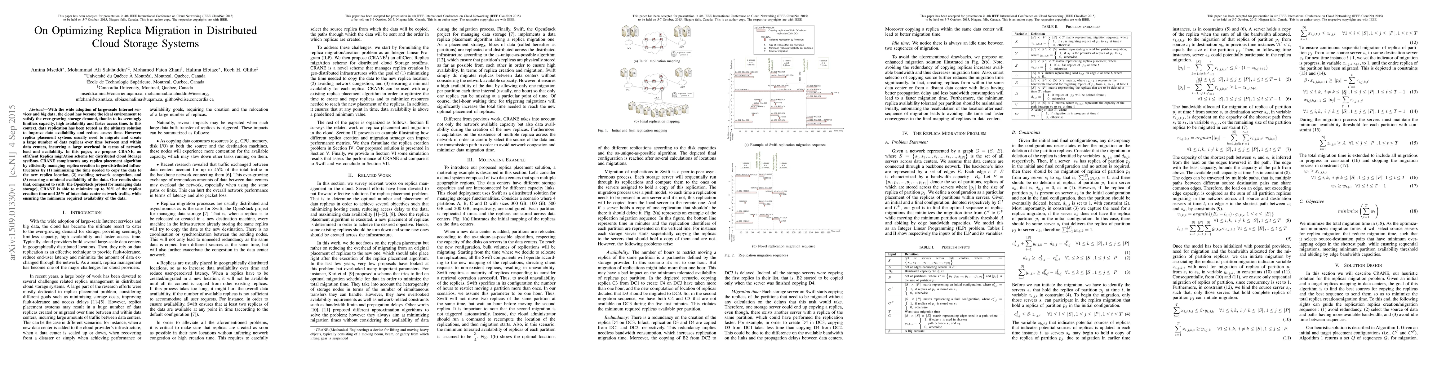 This paper introduces CRANE, a replica migration scheme designed to optimize data replication in distributed cloud storage systems. CRANE minimizes replica creation time, reduces network congestion, and ensures minimal data availability, achieving up to 30% reduction in creation time and 25% reduction in network traffic compared to Swift.