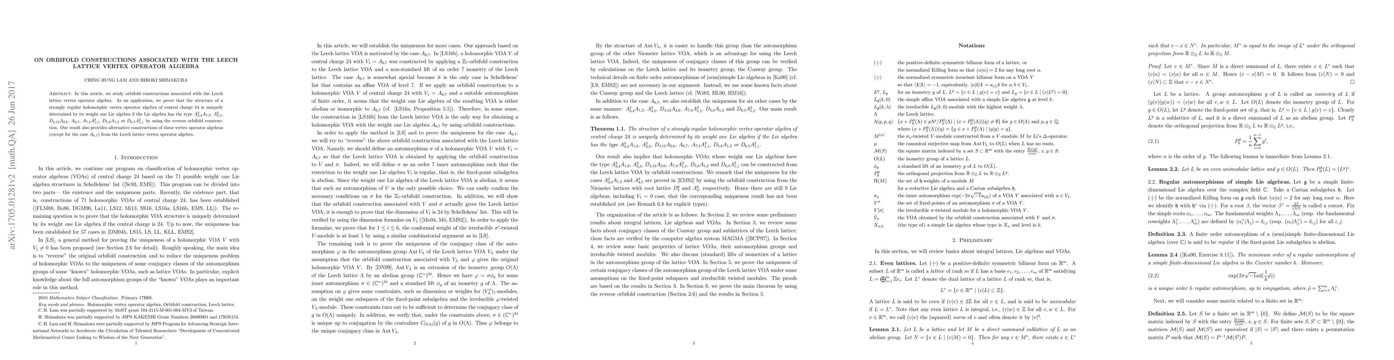 This paper investigates orbifold constructions linked to the Leech lattice vertex operator algebra, proving that a strongly regular holomorphic vertex operator algebra of central charge 24 is uniquely determined by its weight one Lie algebra under specific types, providing alternative constructions from the Leech lattice.