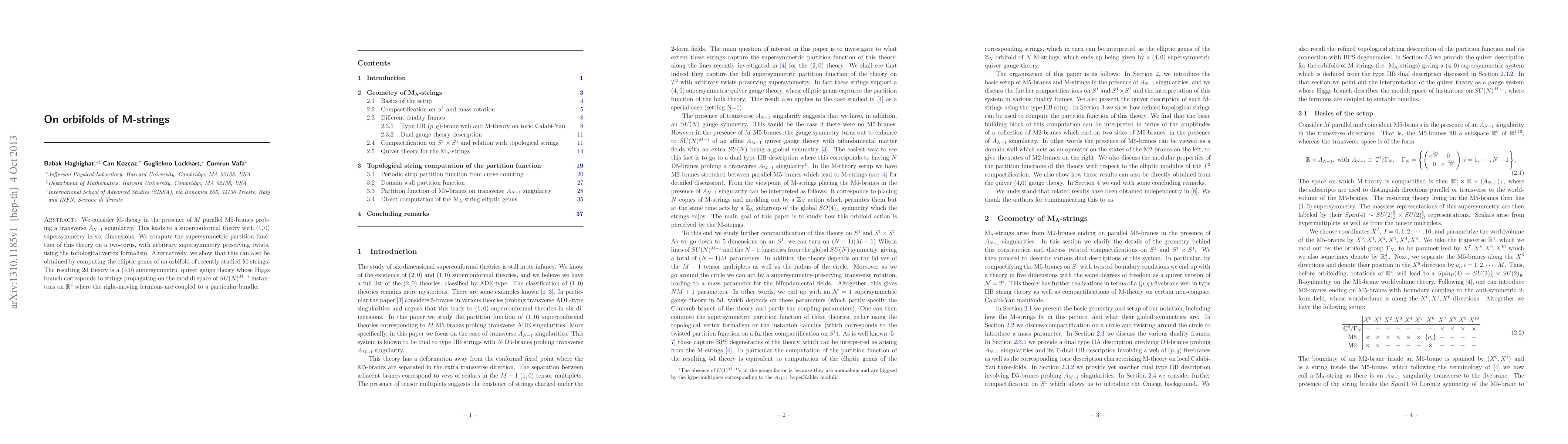 We consider M-theory in the presence of M parallel M5-branes probing a transverse A_{N-1} singularity. This leads to a superconformal theory with (1,0) supersymmetry in six dimensions. We compute the supersymmetric partition function of this theory on a two-torus, with arbitrary supersymmetry preserving twists, using the topological vertex formalism. Alternatively, we show that this can also be obtained by computing the elliptic genus of an orbifold of recently studied M-strings. The resulting 2d theory is a (4,0) supersymmetric quiver gauge theory whose Higgs branch corresponds to strings propagating on the moduli space of SU(N)^{M-1} instantons on R^4 where the right-moving fermions are coupled to a particular bundle.