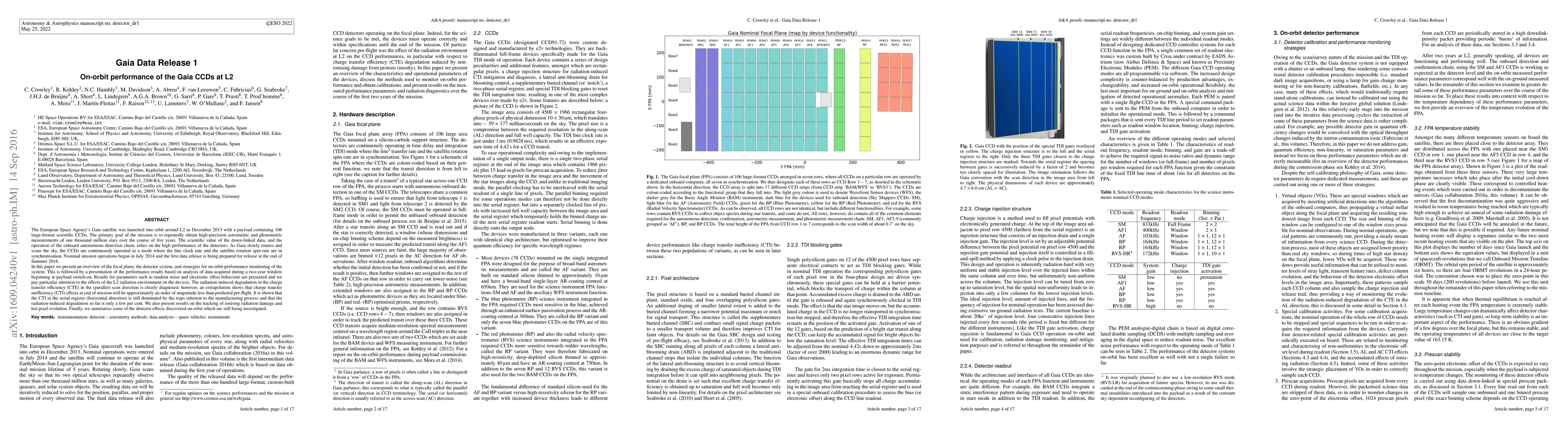The European Space Agency's Gaia satellite was launched into orbit around L2 in December 2013 with a payload containing 106 large-format scientific CCDs. The primary goal of the mission is to repeatedly obtain high-precision astrometric and photometric measurements of one thousand million stars over the course of five years. The scientific value of the down-linked data, and the operation of the onboard autonomous detection chain, relies on the high performance of the detectors. As Gaia slowly rotates and scans the sky, the CCDs are continuously operated in a mode where the line clock rate and the satellite rotation spin-rate are in synchronisation. Nominal mission operations began in July 2014 and the first data release is being prepared for release at the end of Summer 2016. In this paper we present an overview of the focal plane, the detector system, and strategies for on-orbit performance monitoring of the system. This is followed by a presentation of the performance results based on analysis of data acquired during a two-year window beginning at payload switch-on. Results for parameters such as readout noise and electronic offset behaviour are presented and we pay particular attention to the effects of the L2 radiation environment on the devices. The radiation-induced degradation in the charge transfer efficiency (CTE) in the (parallel) scan direction is clearly diagnosed; however, an extrapolation shows that charge transfer inefficiency (CTI) effects at end of mission will be approximately an order of magnitude less than predicted pre-flight. It is shown that the CTI in the serial register (horizontal direction) is still dominated by the traps inherent to the manufacturing process and that the radiation-induced degradation so far is only a few per cent. Finally, we summarise some of the detector effects discovered on-orbit which are still being investigated.