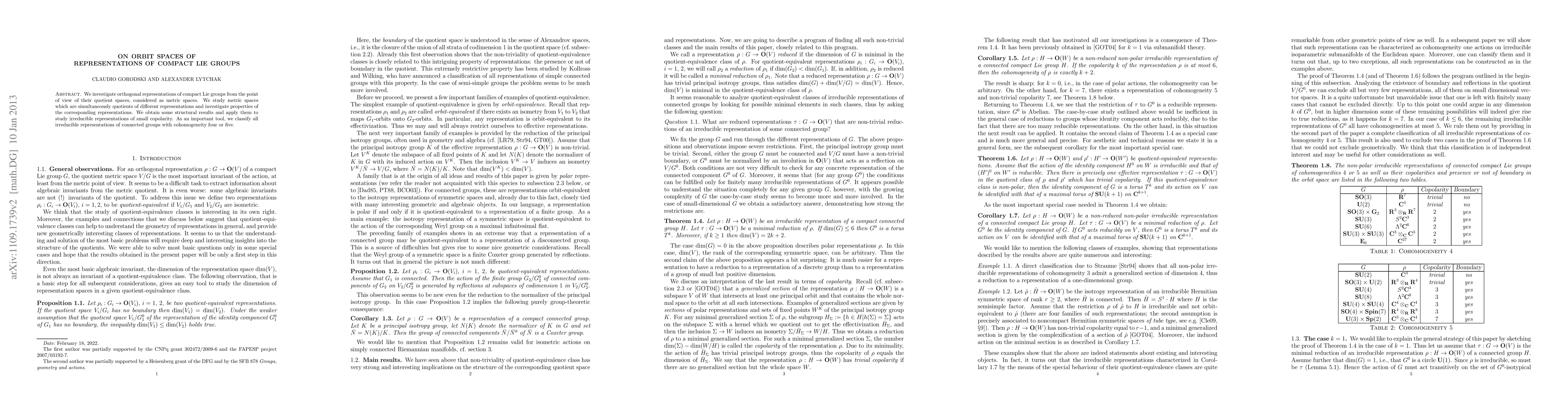 This paper explores the metric properties of quotient spaces derived from orthogonal representations of compact Lie groups, focusing on structural results and applications to irreducible representations of small copolarity. It classifies all irreducible representations of connected groups with cohomogeneity four or five as a key methodological tool.