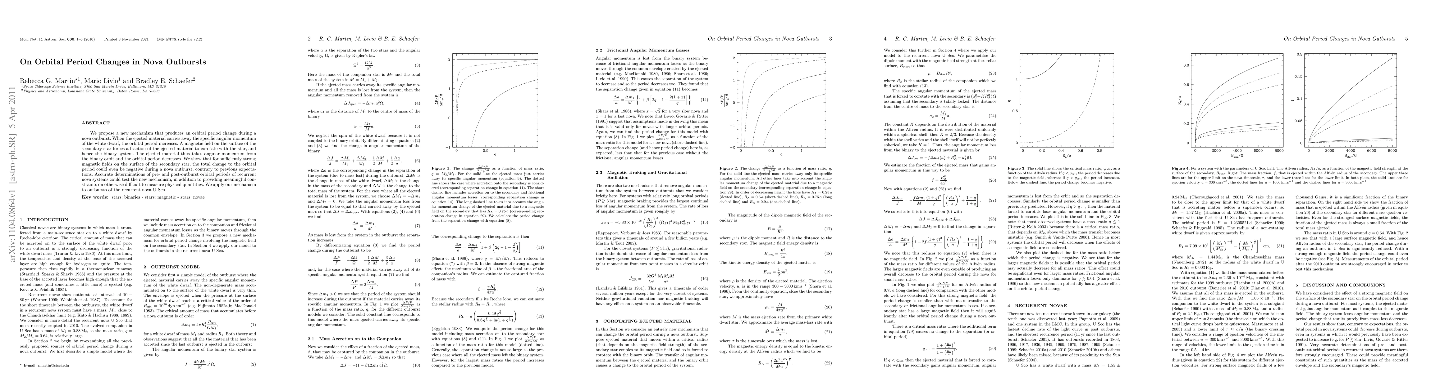 We propose a new mechanism that produces an orbital period change during a nova outburst. When the ejected material carries away the specific angular momentum of the white dwarf, the orbital period increases. A magnetic field on the surface of the secondary star forces a fraction of the ejected material to corotate with the star, and hence the binary system. The ejected material thus takes angular momentum from the binary orbit and the orbital period decreases. We show that for sufficiently strong magnetic fields on the surface of the secondary star, the total change to the orbital period could even be negative during a nova outburst, contrary to previous expectations. Accurate determinations of pre- and post-outburst orbital periods of recurrent nova systems could test the new mechanism, in addition to providing meaningful constraints on otherwise difficult to measure physical quantities. We apply our mechanism to outbursts of the recurrent nova U Sco.
