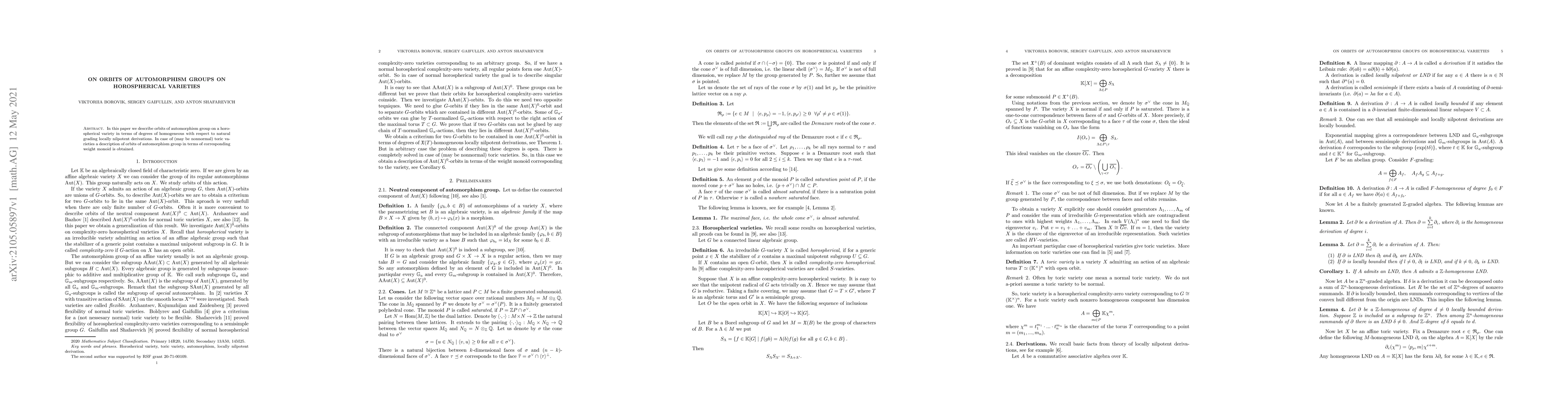 This paper explores the orbits of automorphism groups on horospherical varieties, characterizing them via degrees of homogeneous elements relative to natural gradings and locally nilpotent derivations. For toric varieties, it provides a description of these orbits in terms of the associated weight monoid.