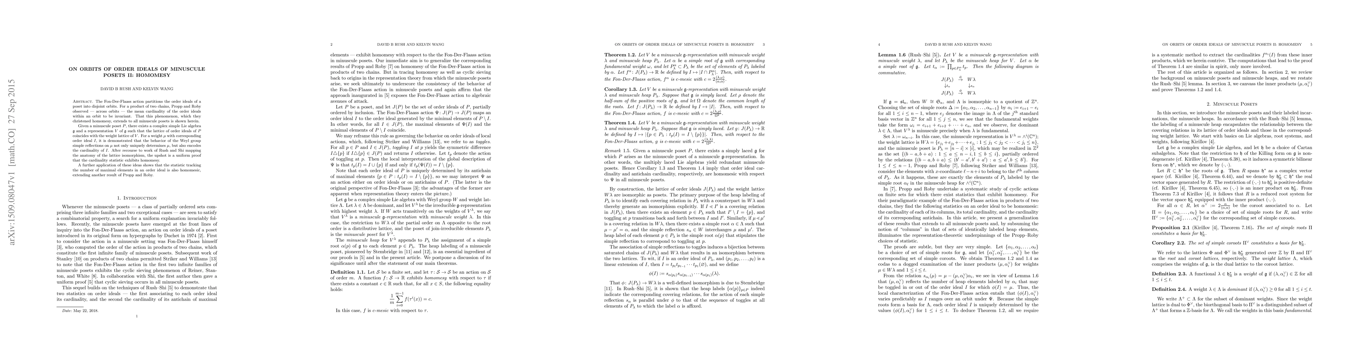 The Fon-Der-Flaass action partitions the order ideals of a poset into disjoint orbits. For a product of two chains, Propp and Roby observed --- across orbits --- the mean cardinality of the order ideals within an orbit to be invariant. That this phenomenon, which they christened homomesy, extends to all minuscule posets is shown herein. Given a minuscule poset $P$, there exists a complex simple Lie algebra $\mathfrak{g}$ and a representation $V$ of $\mathfrak{g}$ such that the lattice of order ideals of $P$ coincides with the weight lattice of $V$. For a weight $\mu$ with corresponding order ideal $I$, it is demonstrated that the behavior of the Weyl group simple reflections on $\mu$ not only uniquely determines $\mu$, but also encodes the cardinality of $I$. After recourse to work of Rush and Shi mapping the anatomy of the lattice isomorphism, the upshot is a uniform proof that the cardinality statistic exhibits homomesy. A further application of these ideas shows that the statistic tracking the number of maximal elements in an order ideal is also homomesic, extending another result of Propp and Roby.