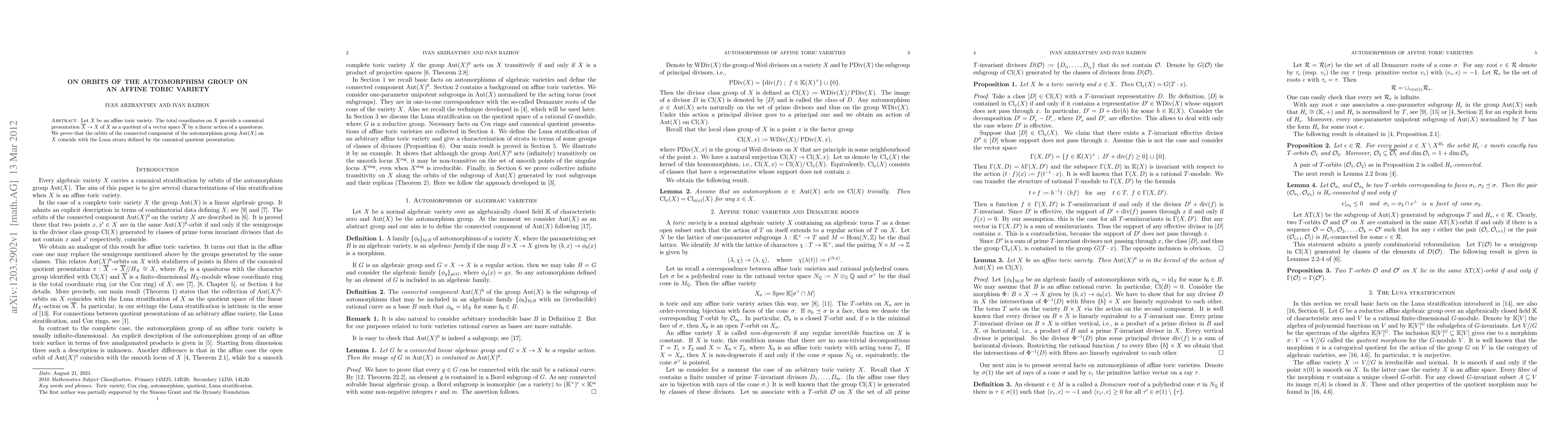 Summary: The paper proves that the orbits of the connected component of the automorphism group on an affine toric variety X correspond to the Luna strata defined by the canonical quotient presentation of X as a vector space quotient. This establishes a connection between the group's action and the variety's stratification.