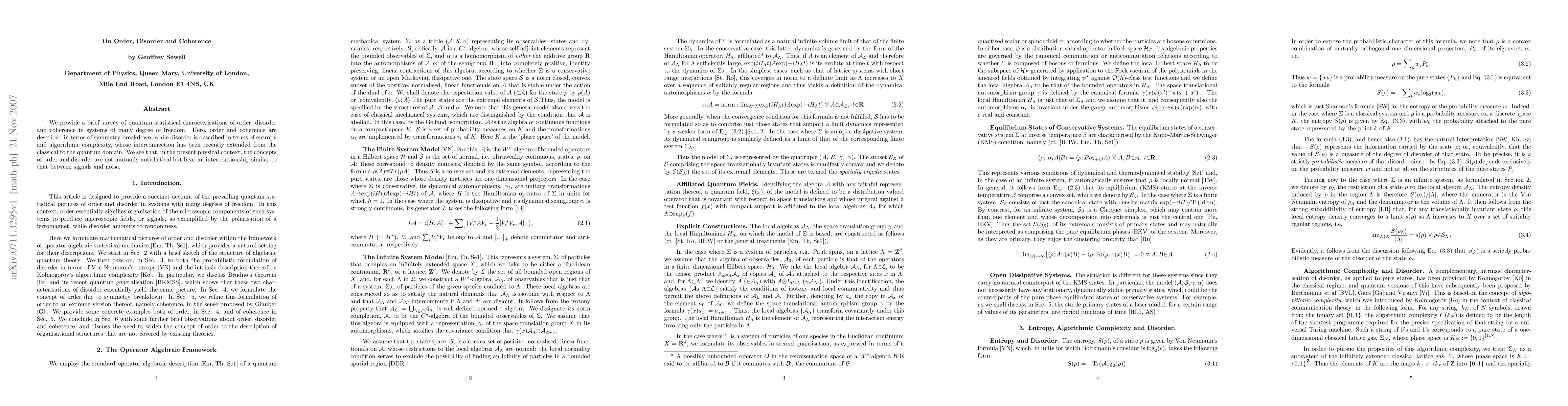 We provide a brief survey of quantum statistical characterisations of order, disorder and coherence in systems of many degrees of freedom. Here, order and coherence are described in terms of symmetry breakdown, while disorder is described in terms of entropy and algorithmic complexity, whose interconnection has been recently extended from the classical to the quantum domain. We see that, in the present physical context, the concepts of order and disorder are not mutually antithetical, but bear an interrelationship similar to that between signals and noise.