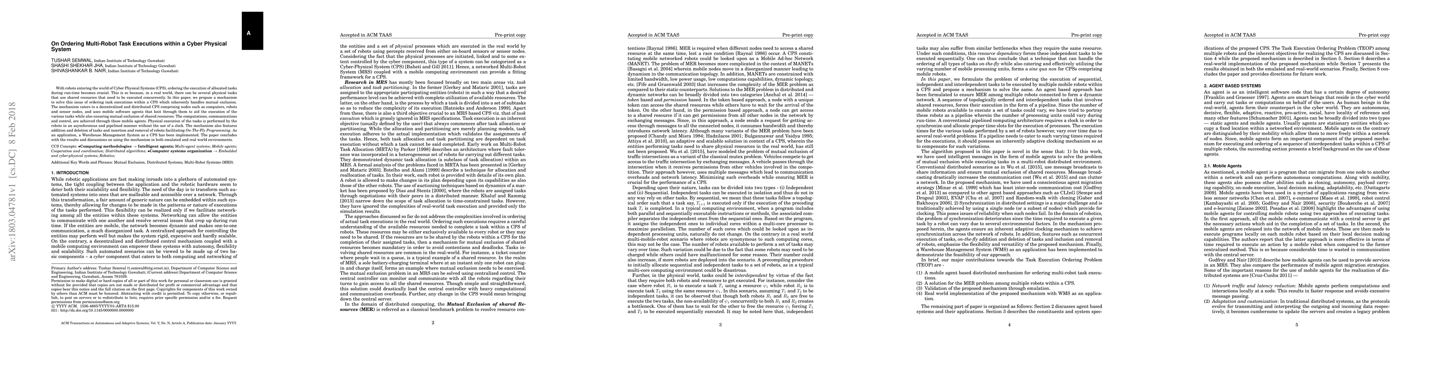 With robots entering the world of Cyber Physical Systems (CPS), ordering the execution of allocated tasks during run-time becomes crucial. This is so because, in a real world, there can be several physical tasks that use shared resources that need to be executed concurrently. In this paper, we propose a mechanism to solve this issue of ordering task executions within a CPS which inherently handles mutual exclusion. The mechanism caters to a decentralized and distributed CPS comprising nodes such as computers, robots and sensor nodes, and uses mobile software agents that knit through them to aid the execution of the various tasks while also ensuring mutual exclusion of shared resources. The computations, communications and control, are achieved through these mobile agents. Physical execution of the tasks is performed by the robots in an asynchronous and pipelined manner without the use of a clock. The mechanism also features addition and deletion of tasks and insertion and removal of robots facilitating \textit{On-The-Fly Programming}. As an application, a Warehouse Management System as a CPS has been implemented. The paper concludes with the results and discussions on using the mechanism in both emulated and real world environments.
