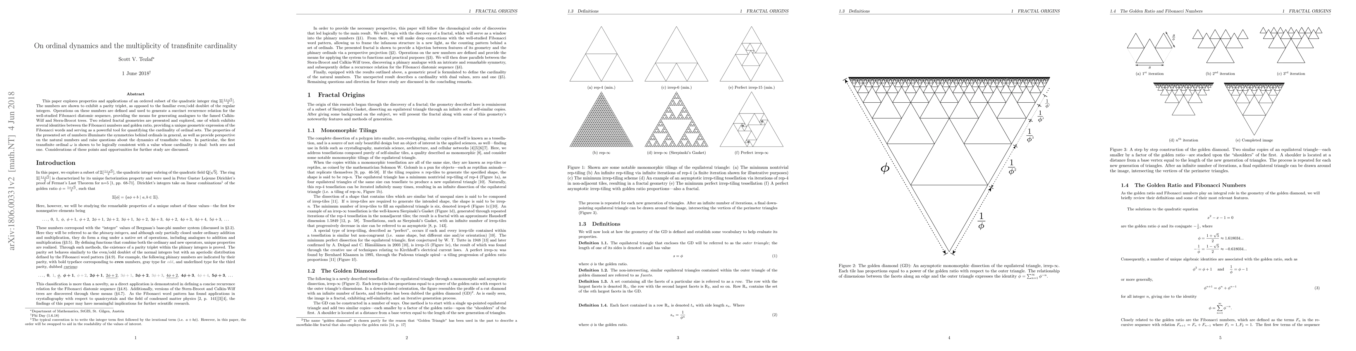 This paper explores properties and applications of an ordered subset of the quadratic integer ring $\mathbb{Z}\left[\frac{1+\sqrt{5}}{2}\right]$. The numbers are shown to exhibit a parity triplet, as opposed to the familiar even/odd doublet of the regular integers. Operations on these numbers are defined and used to generate a succinct recurrence relation for the well-studied Fibonacci diatomic sequence, providing the means for generating analogues to the famed Calkin-Wilf and Stern-Brocot trees. Two related fractal geometries are presented and explored, one of which exhibits several identities between the Fibonacci numbers and golden ratio, providing a unique geometric expression of the Fibonacci words and serving as a powerful tool for quantifying the cardinality of ordinal sets. The properties of the presented set of numbers illuminate the symmetries behind ordinals in general, as well as provide perspective on the natural numbers and raise questions about the dynamics of transfinite values. In particular, the first transfinite ordinal $\omega$ is shown to be logically consistent with a value whose cardinality is dual: both zero and one. Considerations of these points and opportunities for further study are discussed.
