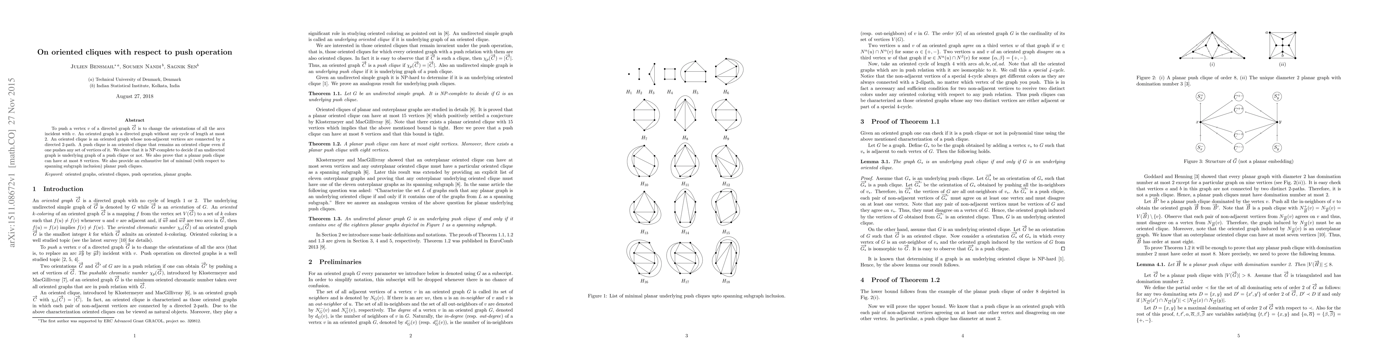 This paper investigates the concept of push cliques in oriented graphs, demonstrating that determining if an undirected graph is an underlying graph for a push clique is NP-complete. It also proves that planar push cliques can have no more than 8 vertices and provides an exhaustive list of minimal planar push cliques.