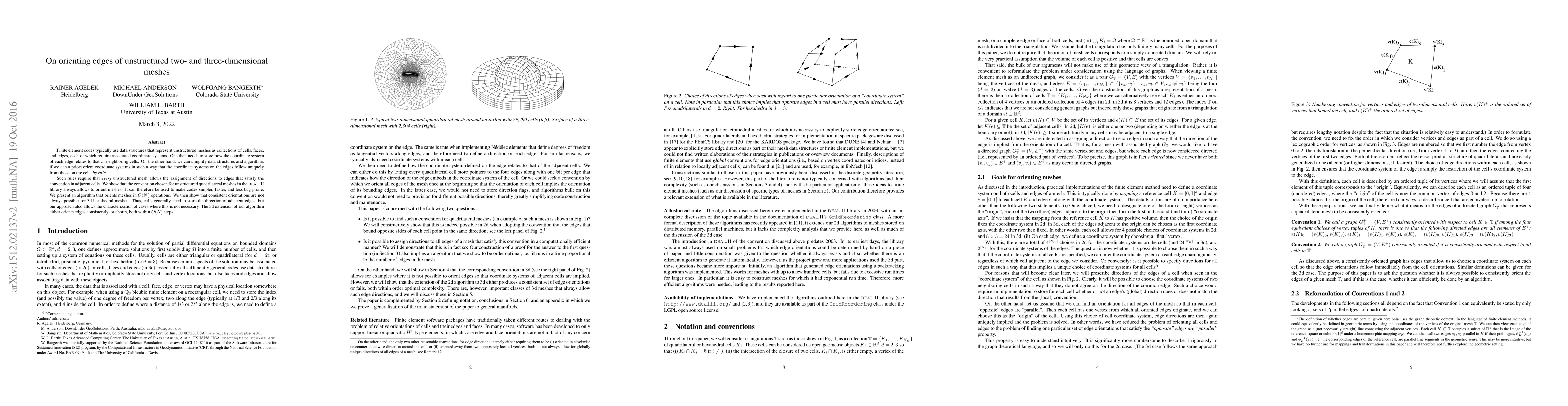 This paper presents an algorithm for orienting edges in unstructured two- and three-dimensional meshes to simplify finite element data structures and algorithms. It shows that the method used for quadrilateral meshes in the deal.II library allows consistent orientation, while three-dimensional hexahedral meshes often require storing edge directions due to inconsistent orientations.