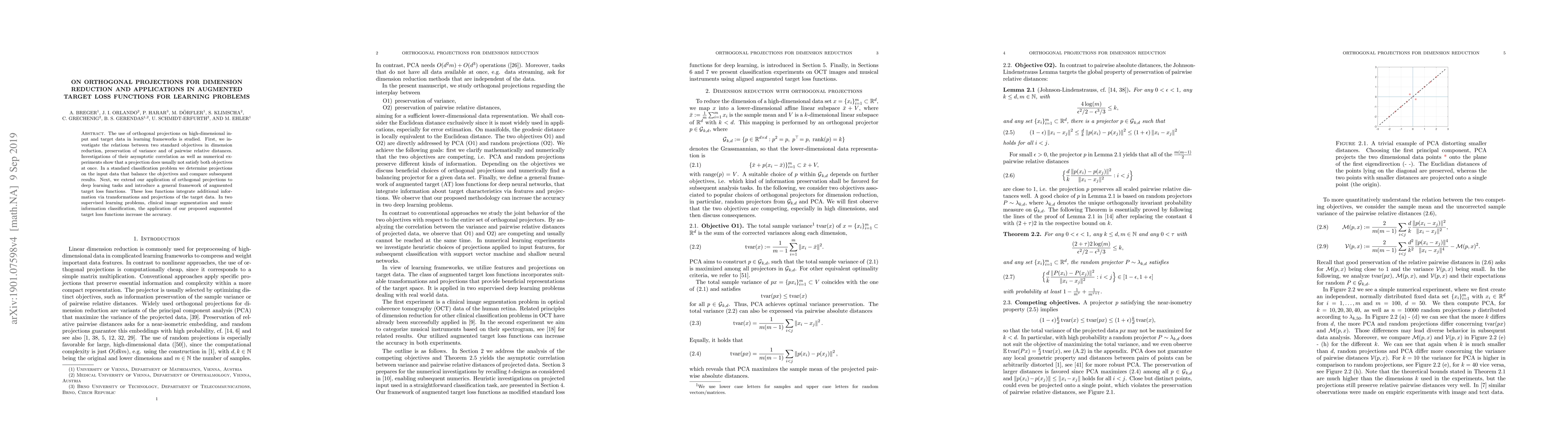 This paper explores the use of orthogonal projections for dimension reduction in learning frameworks, highlighting the trade-offs between variance preservation and pairwise distance preservation. It proposes a balanced projection method for classification and extends this approach to deep learning through augmented target loss functions, which improve accuracy in clinical image segmentation and music information classification.