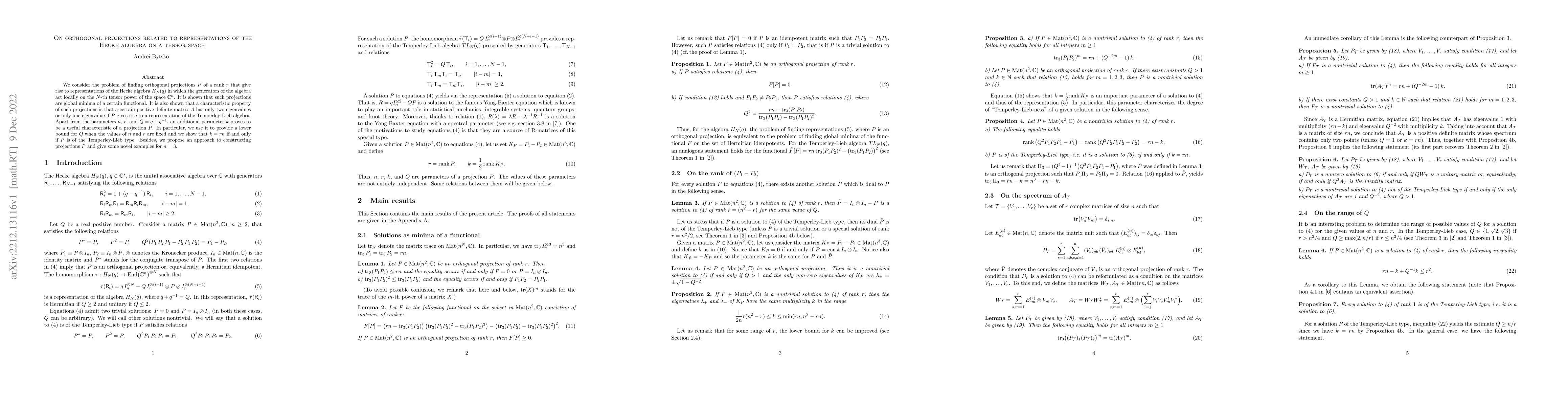 This paper investigates orthogonal projections $P$ of rank $r$ that represent the Hecke algebra $H_N(q)$ acting on the $N$-th tensor power of ${\mathbb C}^n$. It demonstrates that such projections minimize a specific functional and exhibit unique eigenvalue properties for the Temperley-Lieb algebra.