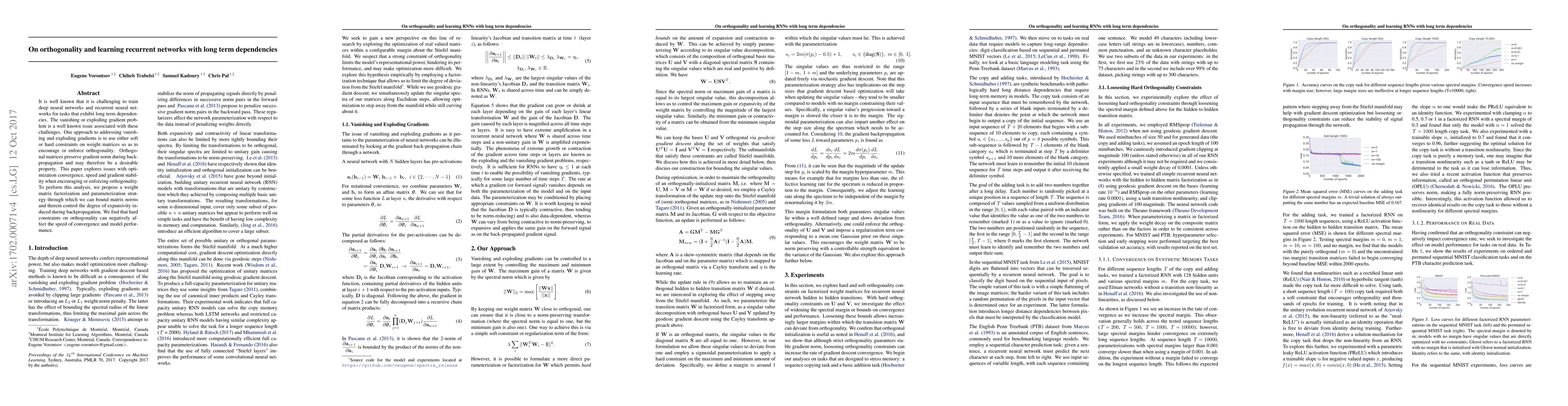 It is well known that it is challenging to train deep neural networks and recurrent neural networks for tasks that exhibit long term dependencies. The vanishing or exploding gradient problem is a well known issue associated with these challenges. One approach to addressing vanishing and exploding gradients is to use either soft or hard constraints on weight matrices so as to encourage or enforce orthogonality. Orthogonal matrices preserve gradient norm during backpropagation and may therefore be a desirable property. This paper explores issues with optimization convergence, speed and gradient stability when encouraging or enforcing orthogonality. To perform this analysis, we propose a weight matrix factorization and parameterization strategy through which we can bound matrix norms and therein control the degree of expansivity induced during backpropagation. We find that hard constraints on orthogonality can negatively affect the speed of convergence and model performance.