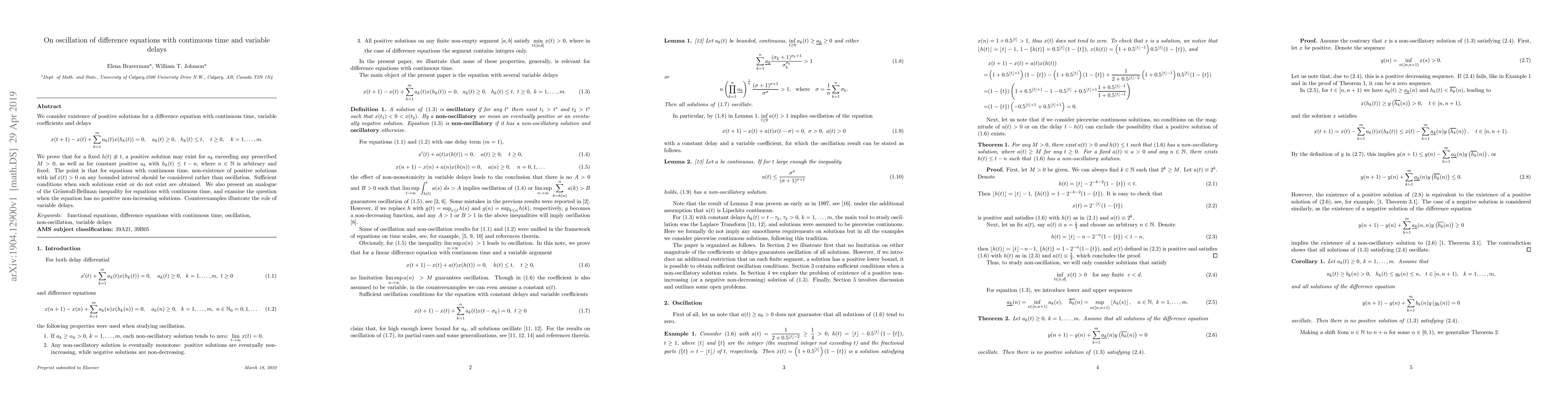 We consider existence of positive solutions for a difference equation with continuous time, variable coefficients and delays $$ x(t+1)-x(t)+ \sum_{k=1}^m a_k(t)x(h_k(t))=0, \quad a_k(t) \geq 0, ~~h_k(t) \leq t, \quad t \geq 0, \quad k=1, \dots, m. $$ We prove that for a fixed $h(t)\not\equiv t$, a positive solution may exist for $a_k$ exceeding any prescribed $M>0$, as well as for constant positive $a_k$ with $h_k(t) \leq t-n$, where $n \in {\mathbb N}$ is arbitrary and fixed. The point is that for equations with continuous time, non-existence of positive solutions with $\inf x(t)>0$ on any bounded interval should be considered rather than oscillation. Sufficient conditions when such solutions exist or do not exist are obtained. We also present an analogue of the Gr\"{o}nwall-Bellman inequality for equations with continuous time, and examine the question when the equation has no positive non-increasing solutions. Counterexamples illustrate the role of variable delays.