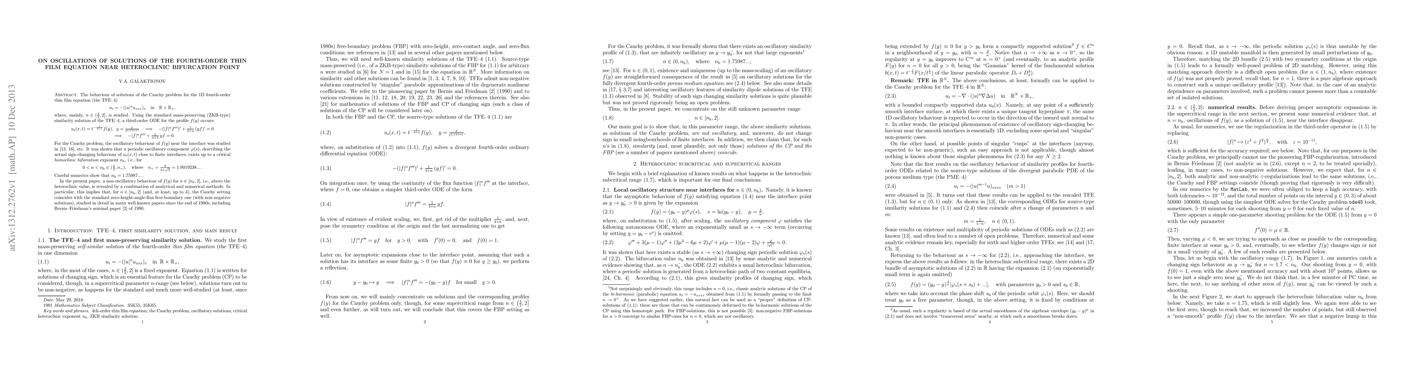 Summary: The study reveals that solutions to the fourth-order thin film equation cease to oscillate and remain non-negative at and above the heteroclinic bifurcation point n=1.75987..., suggesting a convergence with nonnegative solutions of a standard free-boundary problem.