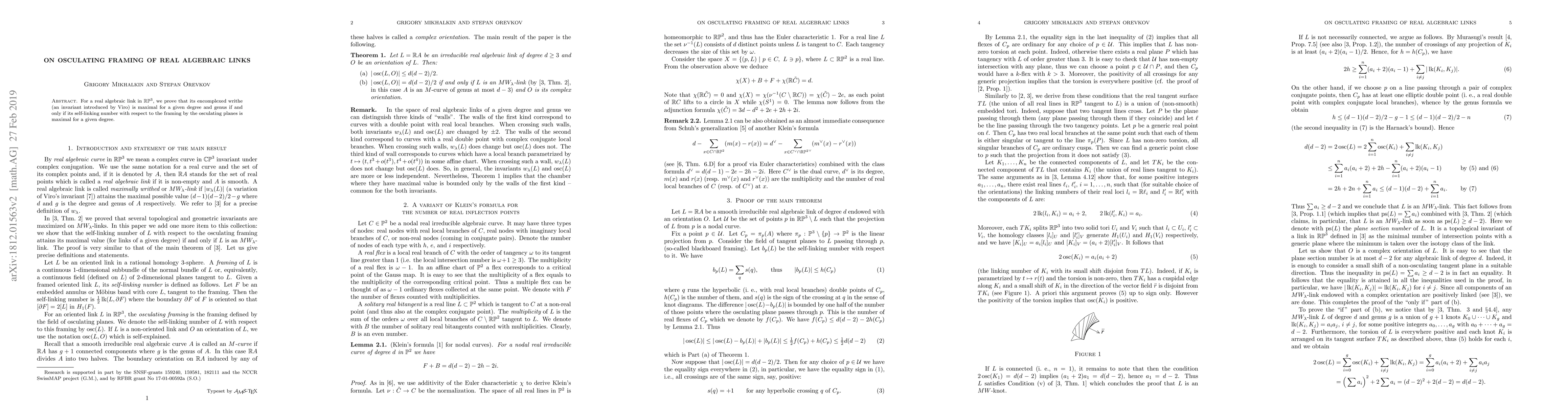 For a real algebraic link in $RP^3$, we prove that its encomplexed writhe (an invariant introduced by Viro) is maximal for a given degree and genus if and only if its self-linking number with respect to the framing by the osculating planes is maximal for a given degree.