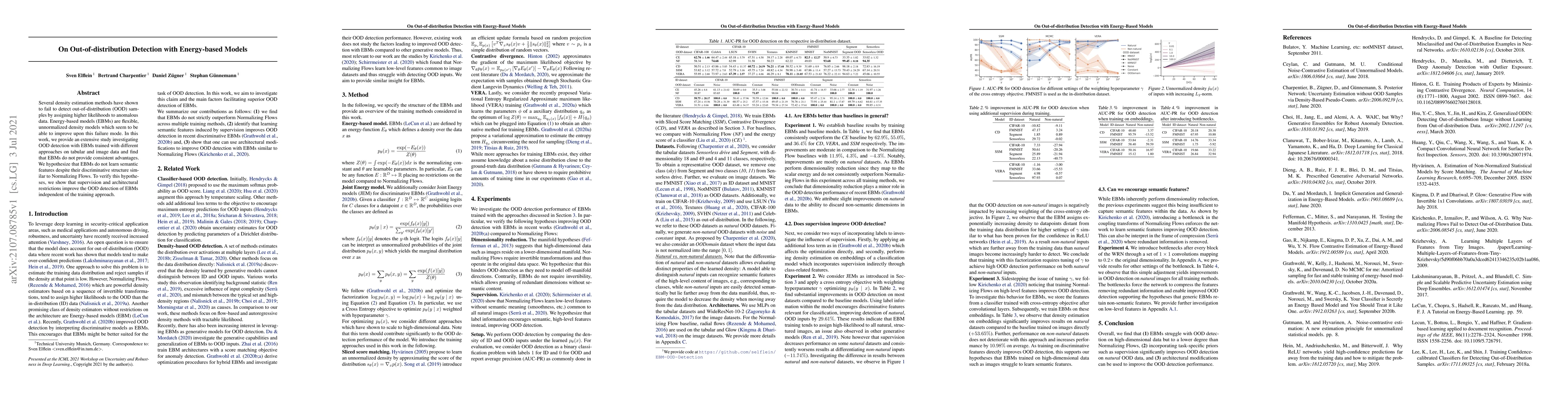 Several density estimation methods have shown to fail to detect out-of-distribution (OOD) samples by assigning higher likelihoods to anomalous data. Energy-based models (EBMs) are flexible, unnormalized density models which seem to be able to improve upon this failure mode. In this work, we provide an extensive study investigating OOD detection with EBMs trained with different approaches on tabular and image data and find that EBMs do not provide consistent advantages. We hypothesize that EBMs do not learn semantic features despite their discriminative structure similar to Normalizing Flows. To verify this hypotheses, we show that supervision and architectural restrictions improve the OOD detection of EBMs independent of the training approach.