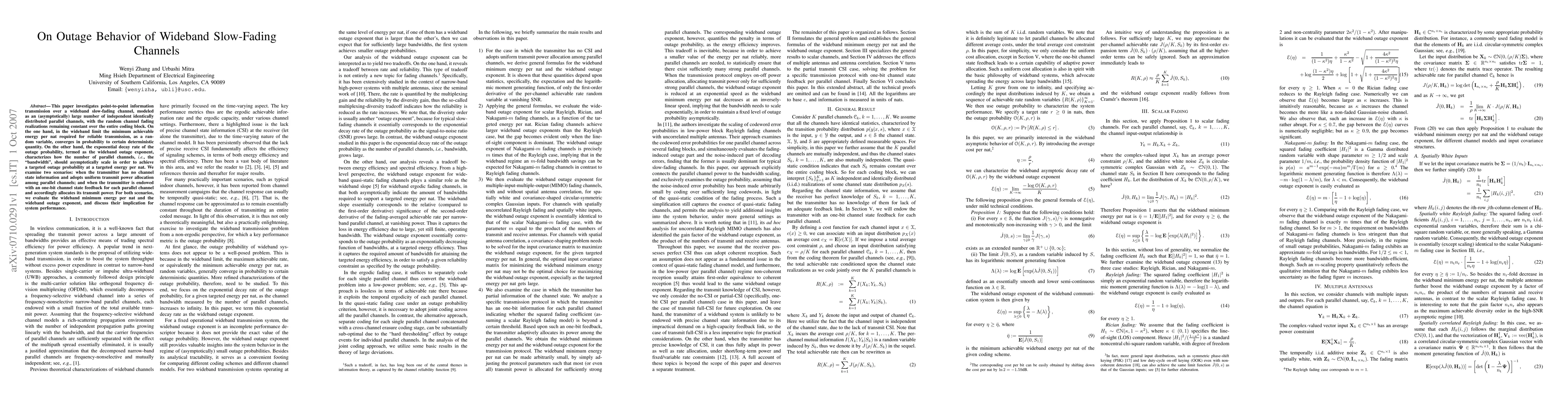 This paper examines the minimum energy per nat for reliable transmission and the wideband outage exponent in wideband slow-fading channels, comparing scenarios with uniform power allocation versus one-bit channel state feedback, to understand the impact of bandwidth scaling on system performance.