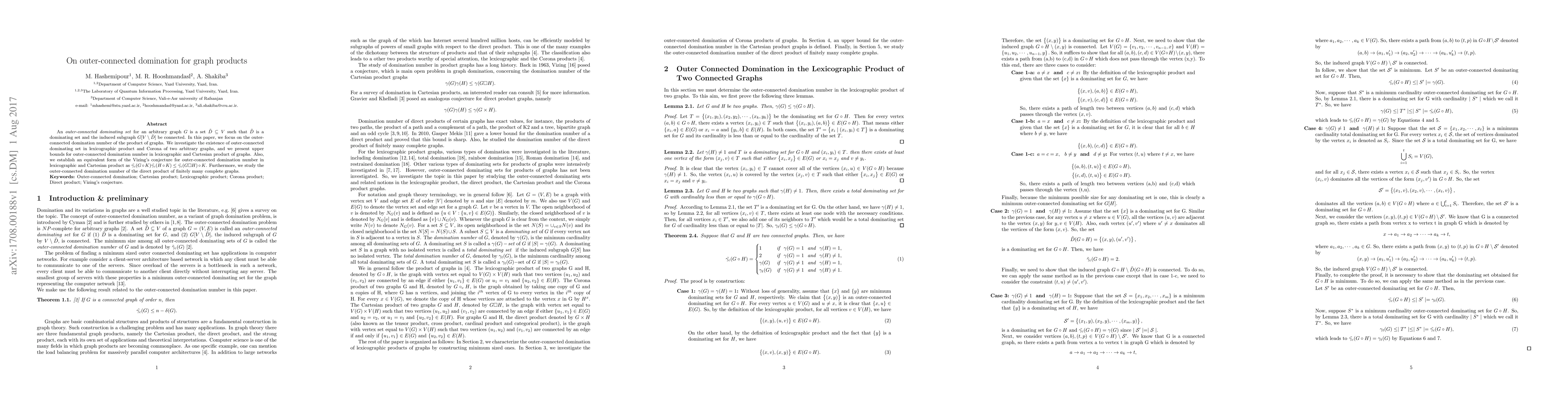 This paper explores the outer-connected domination number in various graph products, focusing on lexicographic and Cartesian products, and establishes bounds for these numbers. It also investigates an equivalent form of Vizing's conjecture for outer-connected domination in these products.