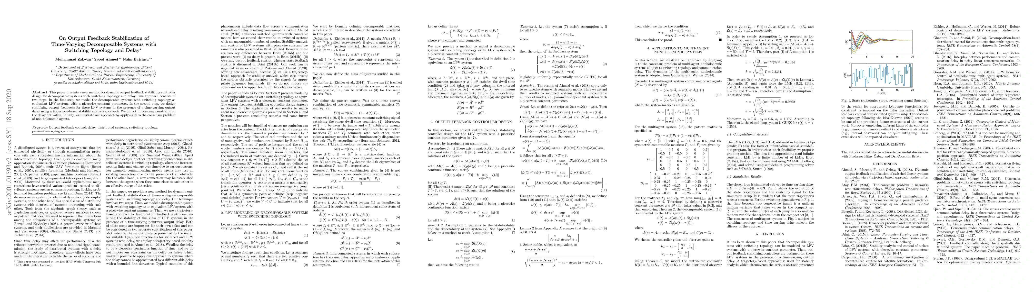 This paper presents a new method for dynamic output feedback stabilizing controller design for decomposable systems with switching topology and delay. Our approach consists of two steps. In the first step, we model the decomposable systems with switching topology as equivalent LPV systems with a piecewise constant parameter. In the second step, we design stabilizing output feedbacks for these LPV systems in the presence of a time-varying output delay using a trajectory-based stability analysis approach. We do not impose any constraint on the delay derivative. Finally, we illustrate our approach by applying it to the consensus problem of non-holonomic agents.
