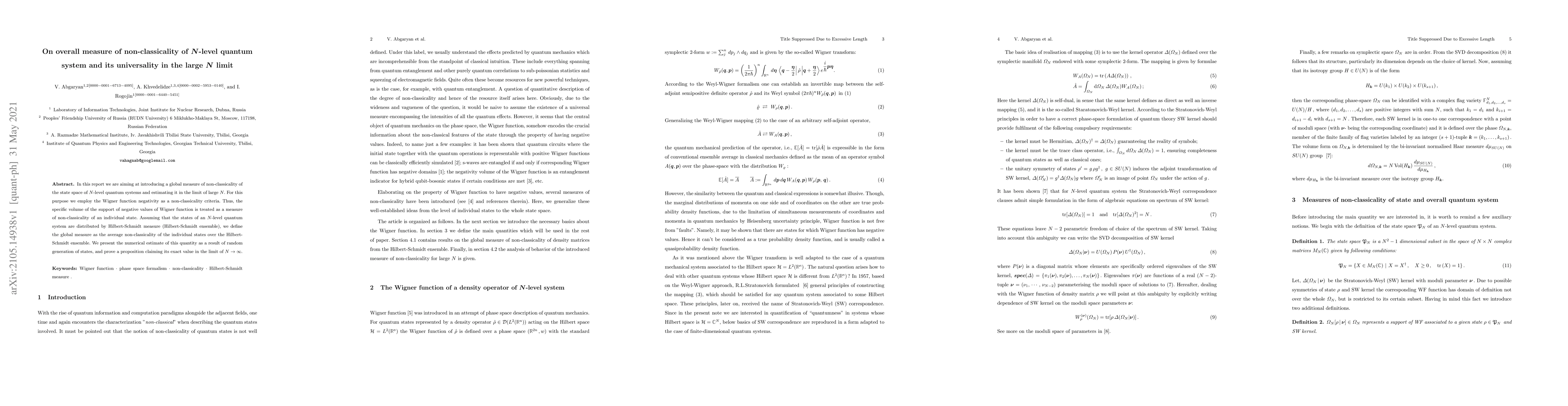 In this report we are aiming at introducing a global measure of non-classicality of the state space of $N$-level quantum systems and estimating it in the limit of large $N$. For this purpose we employ the Wigner function negativity as a non-classicality criteria. Thus, the specific volume of the support of negative values of Wigner function is treated as a measure of non-classicality of an individual state. Assuming that the states of an $N$-level quantum system are distributed by Hilbert-Schmidt measure (Hilbert-Schmidt ensemble), we define the global measure as the average non-classicality of the individual states over the Hilbert-Schmidt ensemble. We present the numerical estimate of this quantity as a result of random generation of states, and prove a proposition claiming its exact value in the limit of $N\to \infty$