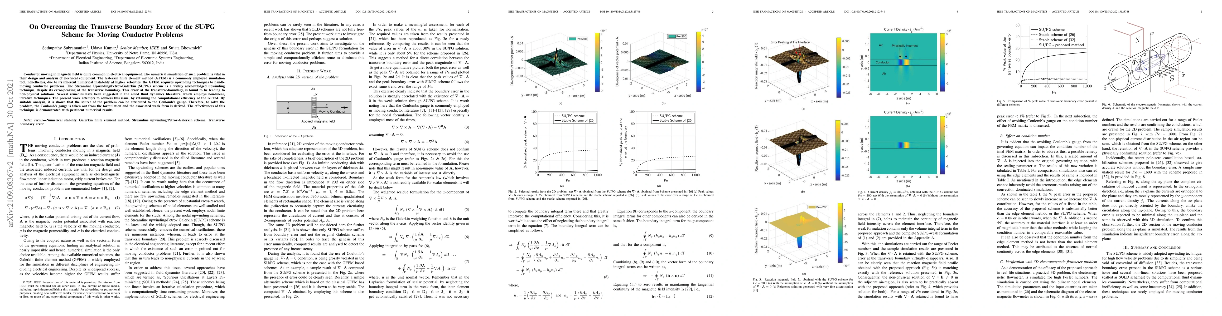 This paper addresses the transverse boundary error in the SU/PG scheme for simulating moving conductors in magnetic fields, attributing it to the Coulomb's gauge. It proposes removing the Coulomb's gauge from the formulation to maintain computational efficiency while achieving more physically accurate solutions, validated through numerical results.
