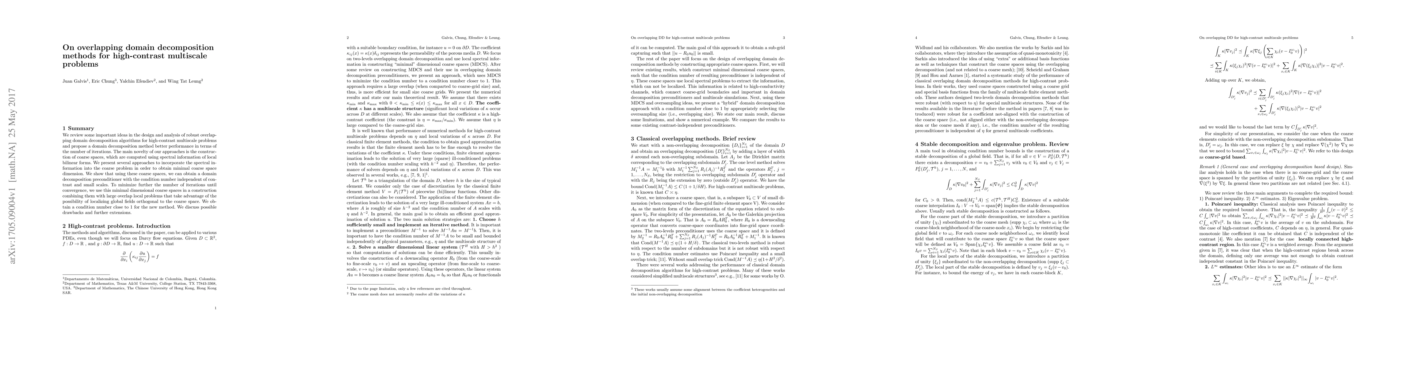 We review some important ideas in the design and analysis of robust overlapping domain decomposition algorithms for high-contrast multiscale problems and propose a domain decomposition method better performance in terms of the number of iterations. The main novelty of our approaches is the construction of coarse spaces, which are computed using spectral information of local bilinear forms. We present several approaches to incorporate the spectral information into the coarse problem in order to obtain minimal coarse space dimension. We show that using these coarse spaces, we can obtain a domain decomposition preconditioner with the condition number independent of contrast and small scales. To minimize further the number of iterations until convergence, we use this minimal dimensional coarse spaces in a construction combining them with large overlap local problems that take advantage of the possibility of localizing global fields orthogonal to the coarse space. We obtain a condition number close to 1 for the new method. We discuss possible drawbacks and further extensions.