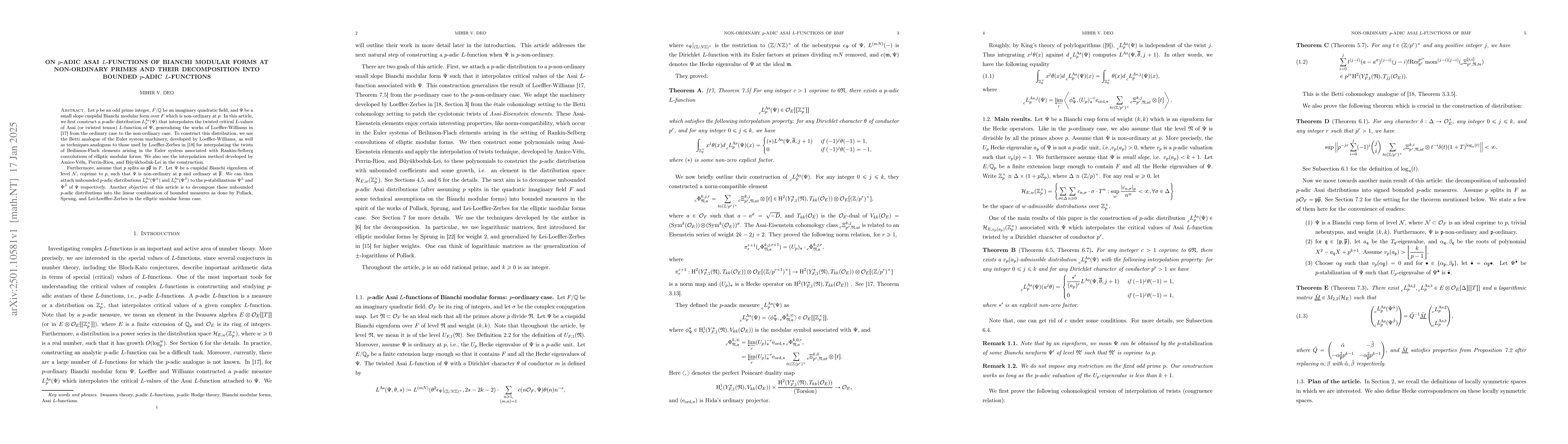 Let $p$ be an odd prime integer, $F/\mathbb{Q}$ be an imaginary quadratic field, and $\Psi$ be a small slope cuspidal Bianchi modular form over $F$ which is non-ordinary at $p$. In this article, we first construct a $p$-adic distribution $L^{\mathrm{As}}_{p}(\Psi)$ that interpolates the twisted critical $L$-values of Asai (or twisted tensor) $L$-function of $\Psi$, generalizing the works of Loeffler-Williams from the ordinary case to the non-ordinary case. To construct this distribution, we use the Betti analogue of the Euler system machinery, developed by Loeffler-Williams, as well as techniques analogous to those used by Loeffler-Zerbes for interpolating the twists of Beilinson-Flach elements arising in the Euler system associated with Rankin-Selberg convolutions of elliptic modular forms. We also use the interpolation method developed by Amice-V\'elu, Perrin-Riou, and B\"uy\"ukboduk-Lei in the construction. Furthermore, assume that $p$ splits as $\mathfrak{p}\overline{\mathfrak{p}}$ in $F$. Let $\Psi$ be a cuspidal Bianchi eigenform of level $\mathcal{N}$, where $\mathcal{N}\subset\mathcal{O}_{F}$ is an ideal coprime to $p$, such that $\Psi$ is non-ordinary at $\mathfrak{p}$ and ordinary at $\overline{\mathfrak{p}}$. We can then attach unbounded $p$-adic distributions $L_{p}^{\mathrm{As}}(\Psi^{\tilde{\alpha}})$ and $L_{p}^{\mathrm{As}}(\Psi^{\tilde{\beta}})$ to the $p$-stabilizations $\Psi^{\tilde{\alpha}}$ and $\Psi^{\tilde{\beta}}$ of $\Psi$ respectively. Another objective of this article is to decompose these unbounded $p$-adic distributions into the linear combination of bounded measures as done by Pollack, Sprung, and Lei-Loeffler-Zerbes in the elliptic modular forms case.