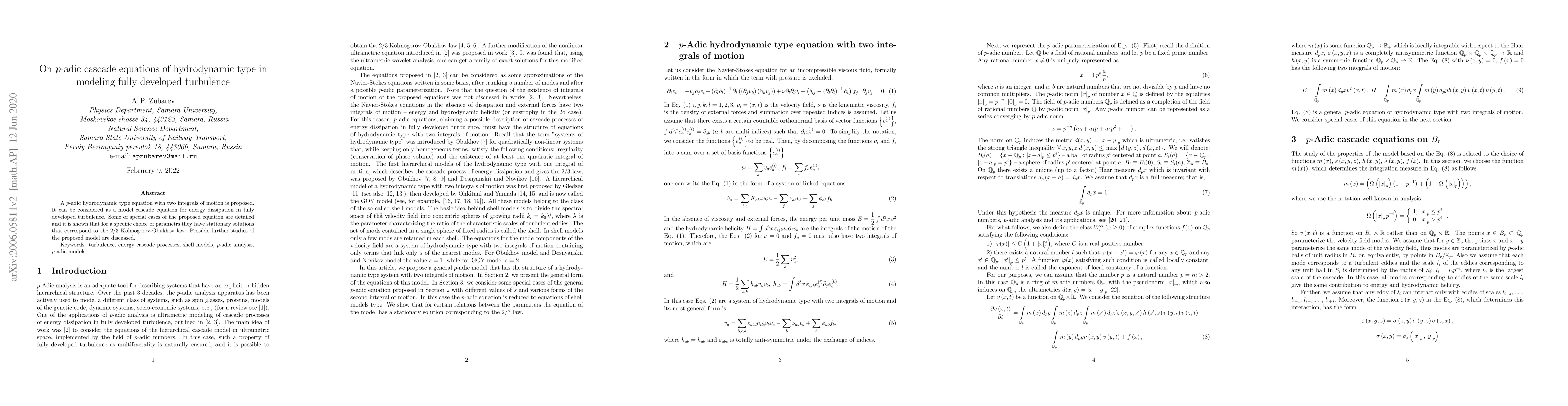 The paper proposes a $p$-adic hydrodynamic type equation with two integrals of motion as a model for energy dissipation in fully developed turbulence. Certain parameter choices yield stationary solutions aligning with the 2/3 Kolmogorov-Obukhov law, suggesting potential for further research.