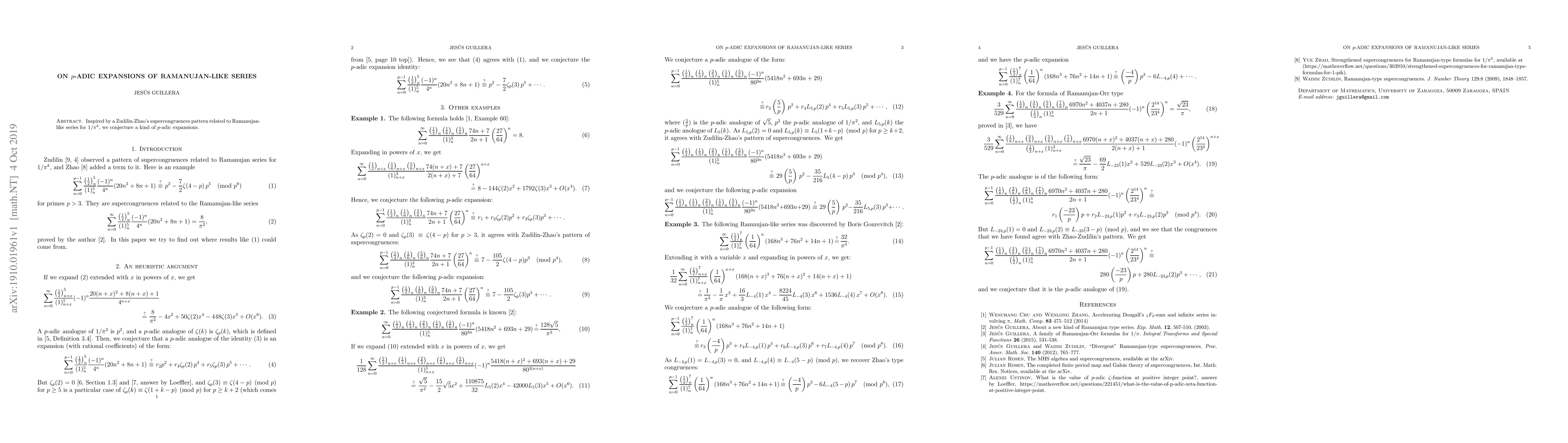 Inspired by a Zudilin-Zhao's supercongruences pattern related to Ramanujan-like series for $1/\pi^k$, we conjecture a kind of $p$-adic expansions.