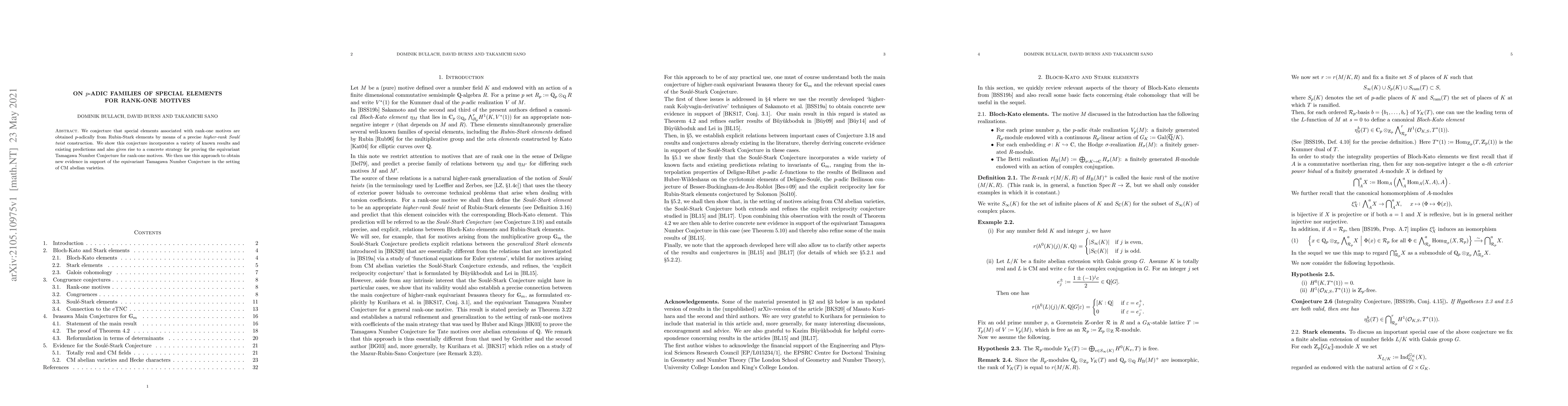 This paper proposes a conjecture linking special elements of rank-one motives to Rubin-Stark elements via a "higher-rank Soulé twist," incorporating existing results and offering a strategy for proving the equivariant Tamagawa Number Conjecture, with new evidence provided for CM abelian varieties.