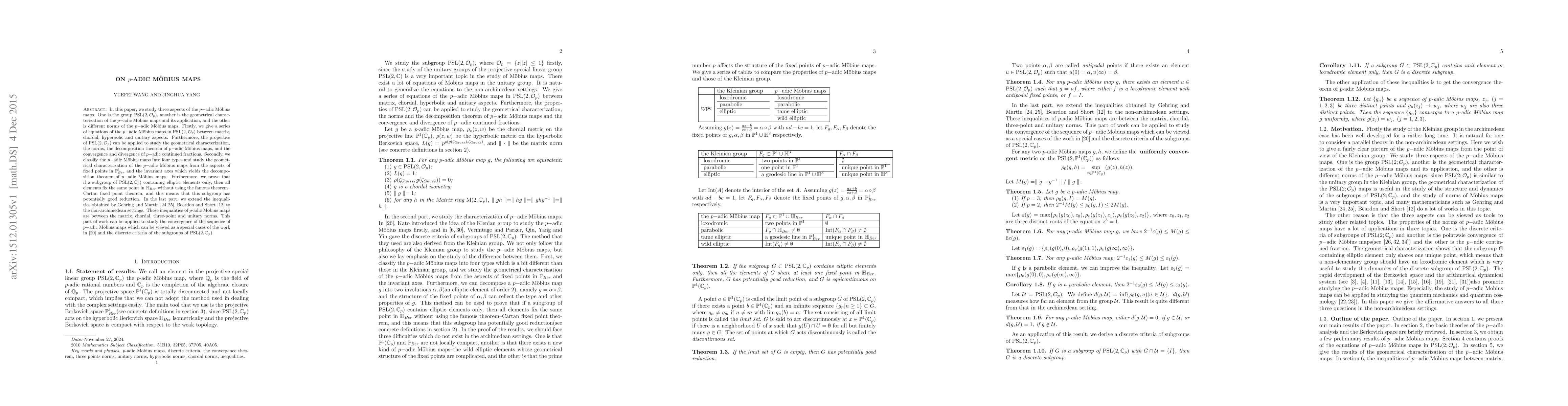 In this paper, we study three aspects of the $p-$adic M\"obius maps. One is the group $\mathrm{PSL}(2,\mathcal{O}_{p})$, another is the geometrical characterization of the $p-$adic M\"obius maps and its application, and the other is different norms of the $p-$adic M\"obius maps. Firstly, we give a series of equations of the $p-$adic M\"obius maps in $\mathrm{PSL}(2,\mathcal{O}_{p})$ between matrix, chordal, hyperbolic and unitary aspects. Furthermore, the properties of $\mathrm{PSL}(2,\mathcal{O}_{p})$ can be applied to study the geometrical characterization, the norms, the decomposition theorem of $p-$adic M\"obius maps, and the convergence and divergence of $p-$adic continued fractions. Secondly, we classify the $p-$adic M\"obius maps into four types and study the geometrical characterization of the $p-$adic M\"obius maps from the aspects of fixed points in $\mathbb{P}^{1}_{Ber}$ and the invariant axes which yields the decomposition theorem of $p-$adic M\"obius maps. Furthermore, we prove that if a subgroup of $\mathrm{PSL}(2,\mathbb{C}_{p})$ containing elliptic elements only, then all elements fix the same point in $\mathbb{H}_{Ber}$ without using the famous theorem--Cartan fixed point theorem, and this means that this subgroup has potentially good reduction. In the last part, we extend the inequalities obtained by Gehring and Martin\cite{F.G1,F.G2}, Beardon and Short \cite{AI} to the non-archimedean settings. These inequalities of $p$-adic M\"obius maps are between the matrix, chordal, three-point and unitary norms. This part of work can be applied to study the convergence of the sequence of $p-$adic M\"obius maps which can be viewed as a special cases of the work in \cite{CJE} and the discrete criteria of the subgroups of $\mathrm{PSL}(2,\mathbb{C}_{p})$.