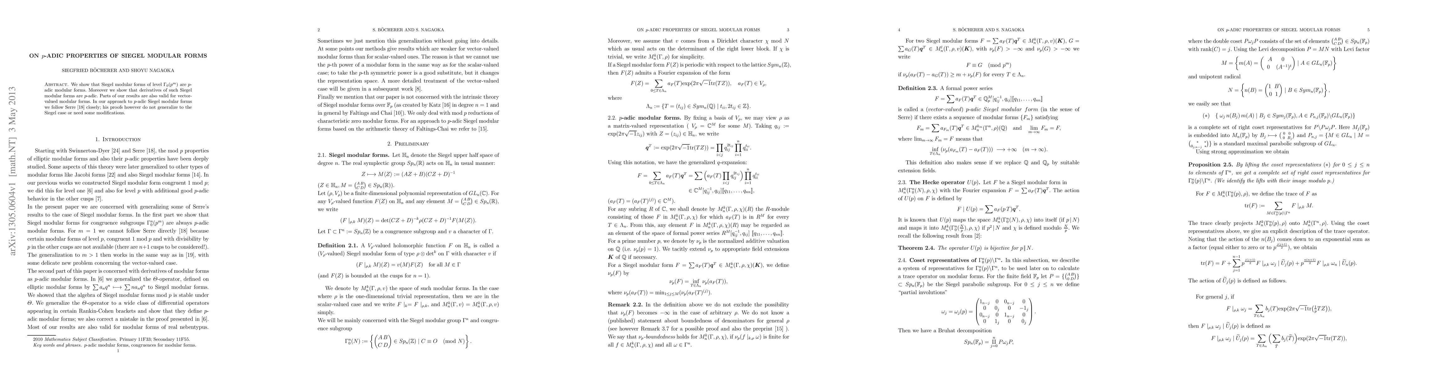 This paper demonstrates that Siegel modular forms of level \(\Gamma_0(p^m)\) are p-adic modular forms, and extends this property to their derivatives. The authors adapt Serre's techniques with necessary modifications to prove these results, also extending parts of the findings to vector-valued modular forms.