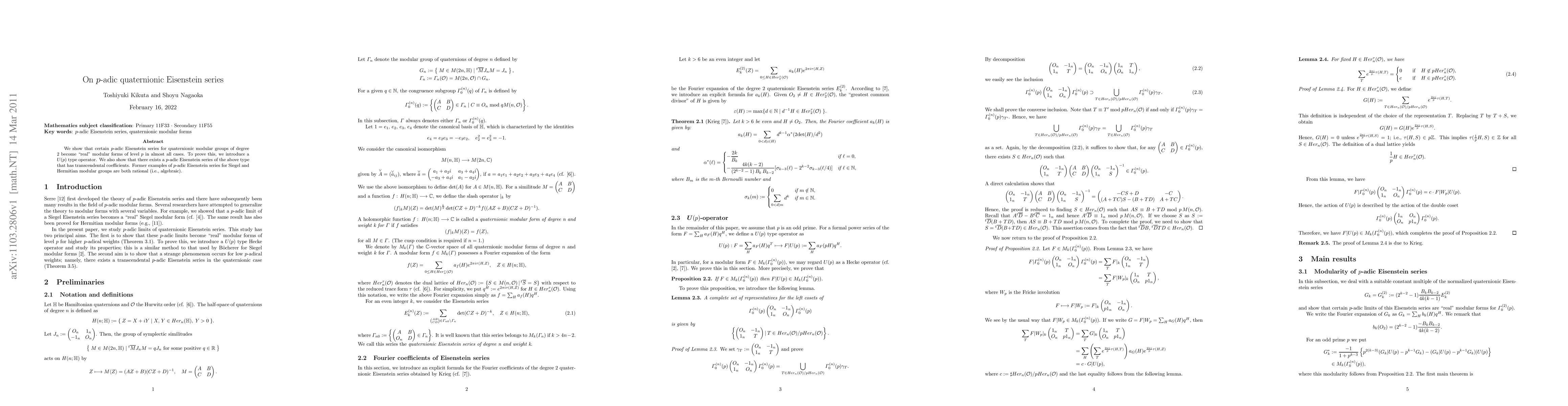 This paper demonstrates that specific $p$-adic Eisenstein series for quaternionic modular groups of degree 2 correspond to "real" modular forms of level $p$ in most cases, utilizing a $U(p)$ type operator. It also reveals a $p$-adic Eisenstein series with transcendental coefficients, contrasting previous rational examples for Siegel and Hermitian modular groups.