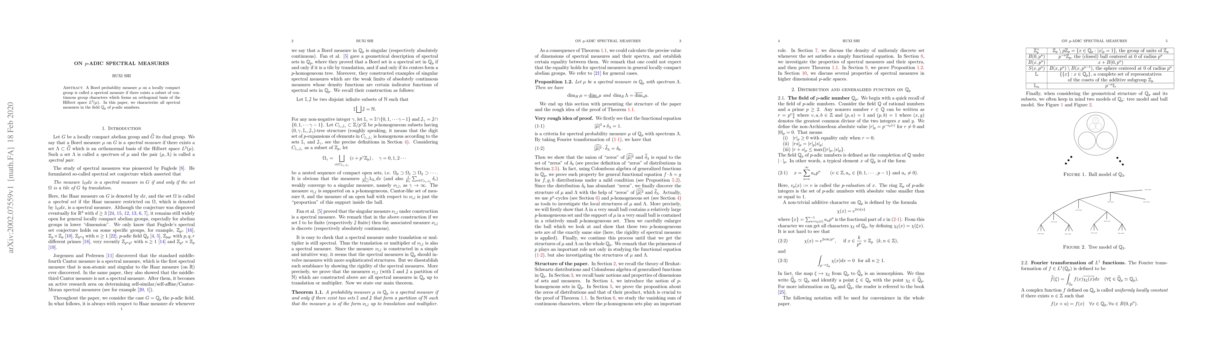 Researchers in $p$-adic numbers characterized spectral measures as sets of orthogonal continuous group characters that form a basis for the Hilbert space $L^2( ext{measure})$. They found these measures exist only when the measure is concentrated on finite sets.