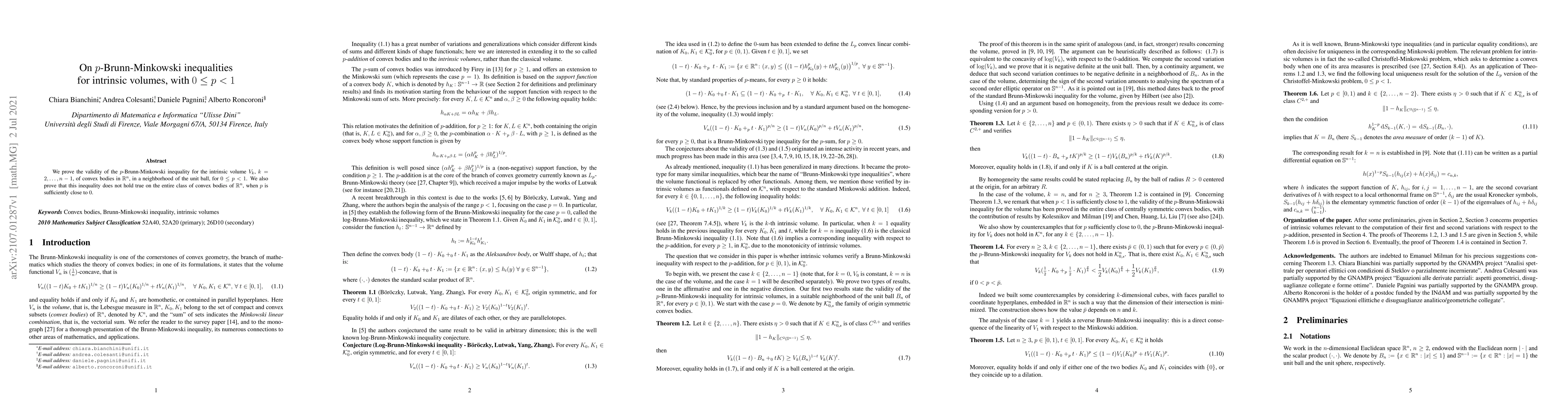 The paper proves the $p$-Brunn-Minkowski inequality for intrinsic volumes of convex bodies in $\mathbb{R}^n$ within a neighborhood of the unit ball for $0\le p<1$, but finds it fails globally when $p$ is near $0$.