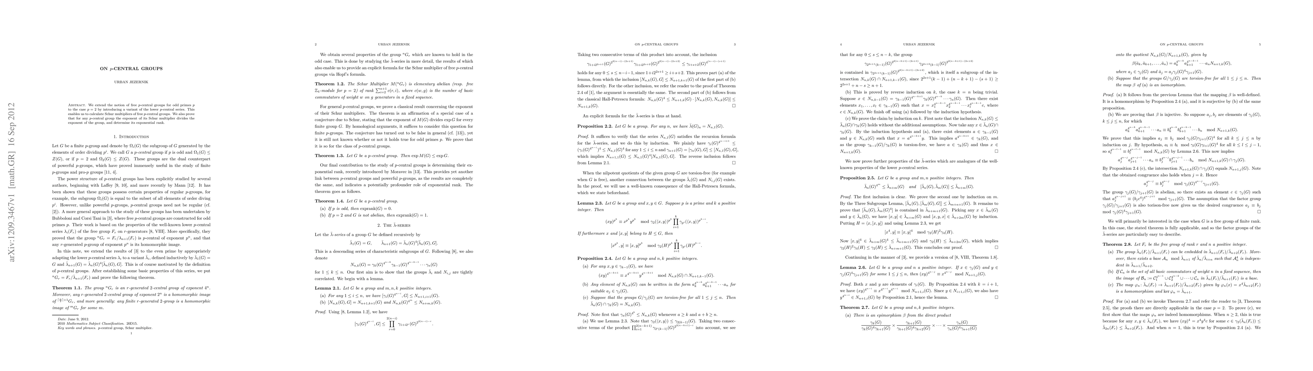 This paper extends the concept of free $p$-central groups to $p=2$ using a modified lower $p$-central series, allowing for the calculation of their Schur multipliers. It also establishes that the exponent of the Schur multiplier divides the exponent of the $p$-central group and determines its exponential rank.