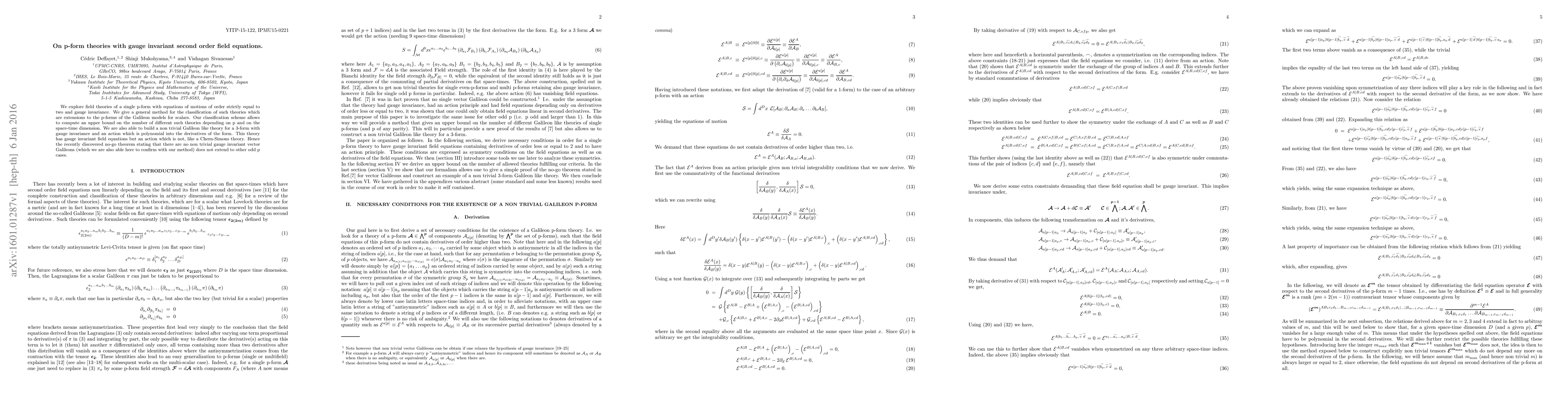 We explore field theories of a single p-form with equations of motions of order strictly equal to two and gauge invariance. We give a general method for the classification of such theories which are extensions to the p-forms of the Galileon models for scalars. Our classification scheme allows to compute an upper bound on the number of different such theories depending on p and on the space-time dimension. We are also able to build a non trivial Galileon like theory for a 3-form with gauge invariance and an action which is polynomial into the derivatives of the form. This theory has gauge invariant field equations but an action which is not, like a Chern-Simons theory. Hence the recently discovered no-go theorem stating that there are no non trivial gauge invariant vector Galileons (which we are also able here to confirm with our method) does not extend to other odd p cases.